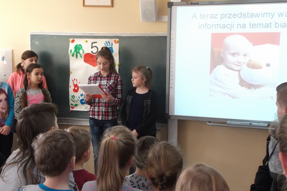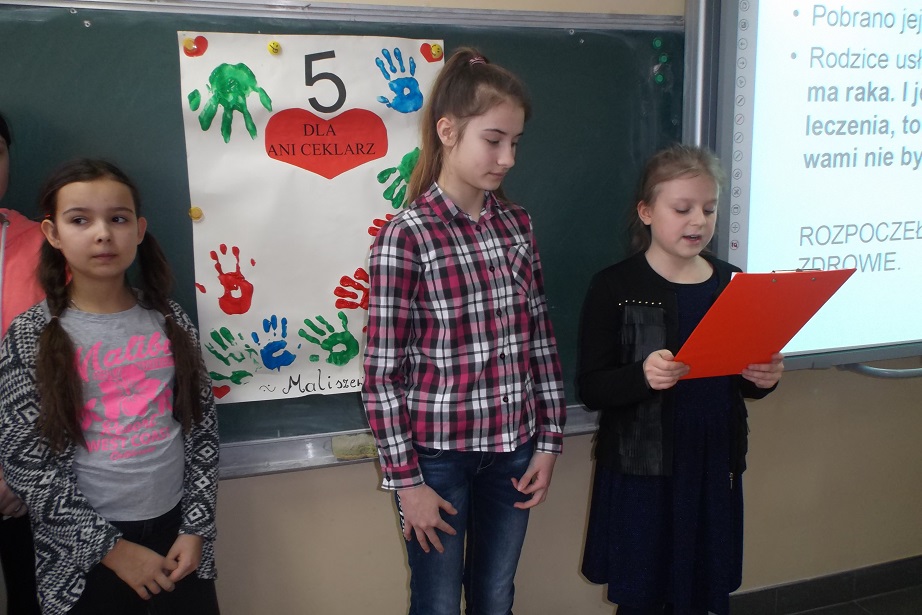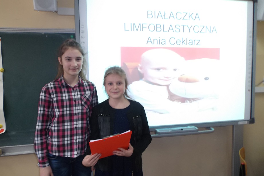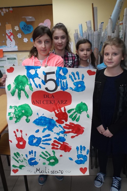 Szkoła Podstawowa im. F. Żwirki i S. Wigury w Maliszewie aktywnie włączyła się w akcję pomocy dla Ani Ceklarz chorującej na nowotwór krwi. Aby przybliżyć dzieciom, na czym polega choroba Ani, uczniowie klasy V – Aleksandra Sztankowska i Weronika Osendowska - przygotowały prezentację multimedialną na temat białaczki limfoblastycznej, którą zaprezentowały całej społeczności szkolnej.