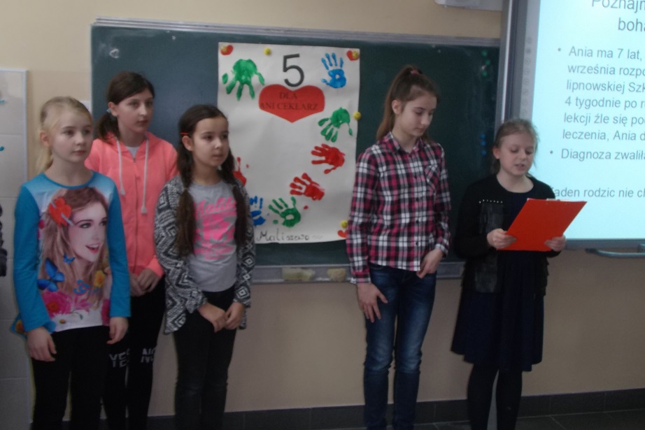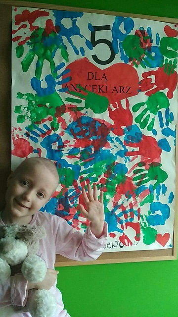 Dzieci i nauczyciele przybijali również „5” na plakacie przygotowanym specjalnie na tę okazję oraz tworzyli rysunki dla dziewczynki. Ania zaczarowała wszystkich swoim uśmiechem, więc spora grupa osób włączyła się do akcji zbierania kolorowych skarpetek. Odbył się także kiermasz ciast i loteria fantowa, z których dochód został przekazany na konto Fundacji Pomocy Dzieciom i Osobom Chorym Kawałek Nieba.