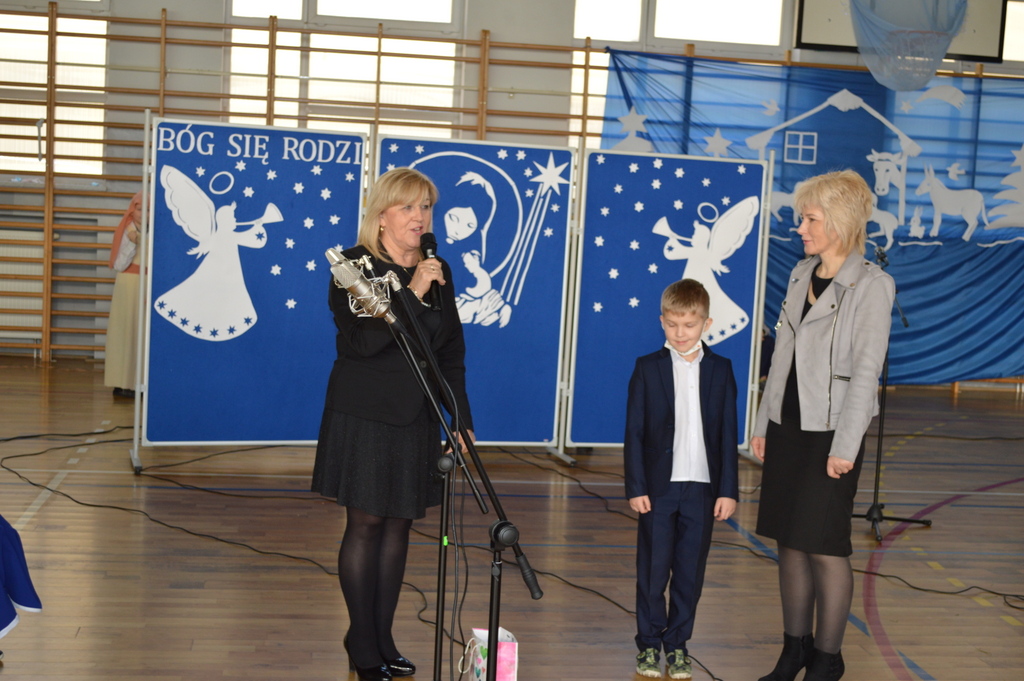 Po skończonym przedstawieniu p. dyrektor Iwona Rutkowska złożyła życzenia świąteczne całej społeczności szkolnej oraz ogłosiła wyniki konkursu „Na najładniejszy wystrój świąteczny sali lekcyjnej” przeprowadzonego przez siebie.