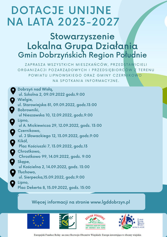 Stowarzyszenie Lokalna Grupa Działania Gmin Dobrzyńskich Region Południe zaprasza wszystkich mieszkańców, przedstawicieli organizacji pozarządowych i przedsiębiorców z terenu powiatu lipnowskiego oraz gminy Czernikowo na spotkania informacyjne.