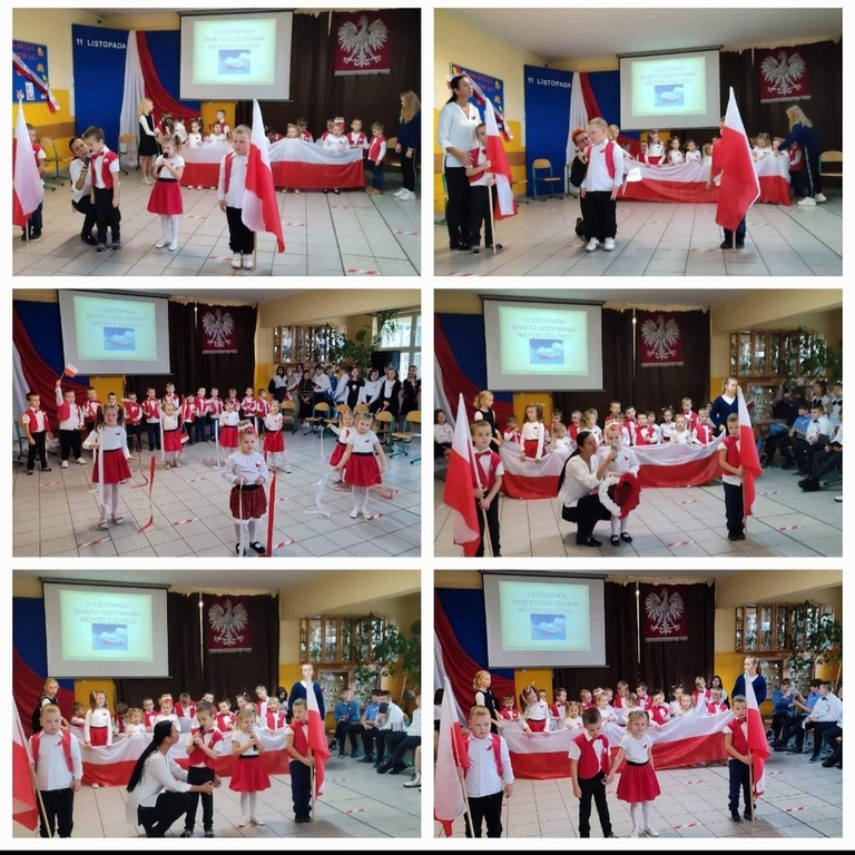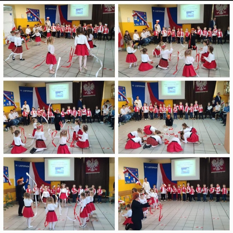 Przedszkolaki z grupy „Biedronki” od paru tygodni przygotowywały się do tego ważnego wydarzenia pod kierunkiem pani Wioletty Drożyńskiej oraz pani Doroty Gójskiej. Przedszkolaki pięknie wyrecytowały wiersze pt.”Barwy ojczyste” oraz „11 listopada”, zaśpiewały piosenkę pt.”Żeby Polska była polska” oraz zaprezentowały układ taneczny. W dalszej kolejności akademii głos zabrali uczniowie z klasy V,VI,VIII pod kierunkiem pani Magdaleny Złakowskiej i pana Kamila Komorowskiego, przedstawiając uroczysty występ z okazji Święta naszej ojczyzny. Natomiast uczniowie z klasy IV zatańczyli polkę oraz fokstrota pod kierunkiem pani Krzysztofy Grzywińskiej.