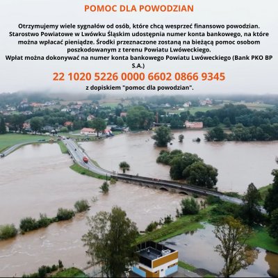 Niezależnie od powyższego każdy może wpłacać samodzielnie środki pieniężne bezpośrednio na konto bankowe Starostwa Powiatowego w Lwówku Śląskim nr 22 1020 5226 0000 6602 0866 9345 z dopiskiem „Pomoc dla powodzian”.