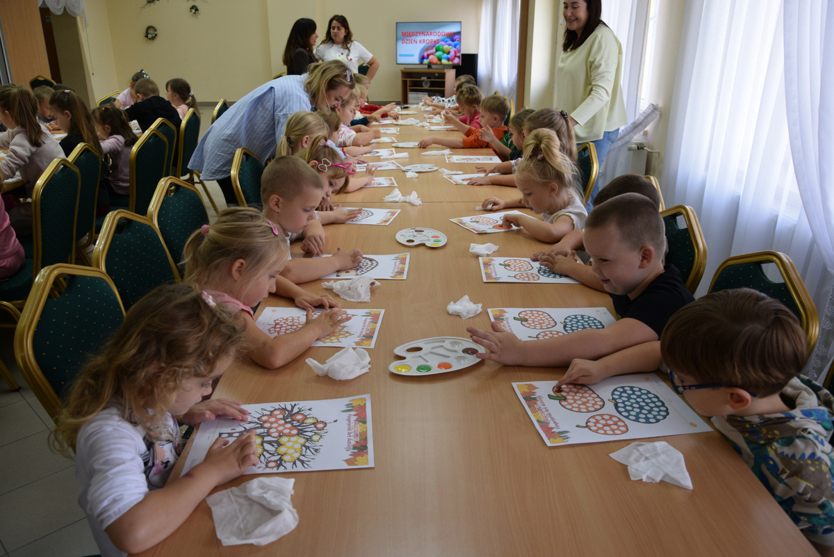 W zajęciach wzięły udział dzieci 5-letnie i 6-letnie, które miały okazję wyrazić swoją twórczość poprzez prace plastyczne malowane farbami przy użyciu własnych paluszków. Powstały kolorowe, pełne wyobraźni dzieła, w których – jak przystało na Dzień Kropki – królował ten niewielki, ale bardzo znaczący kształt.