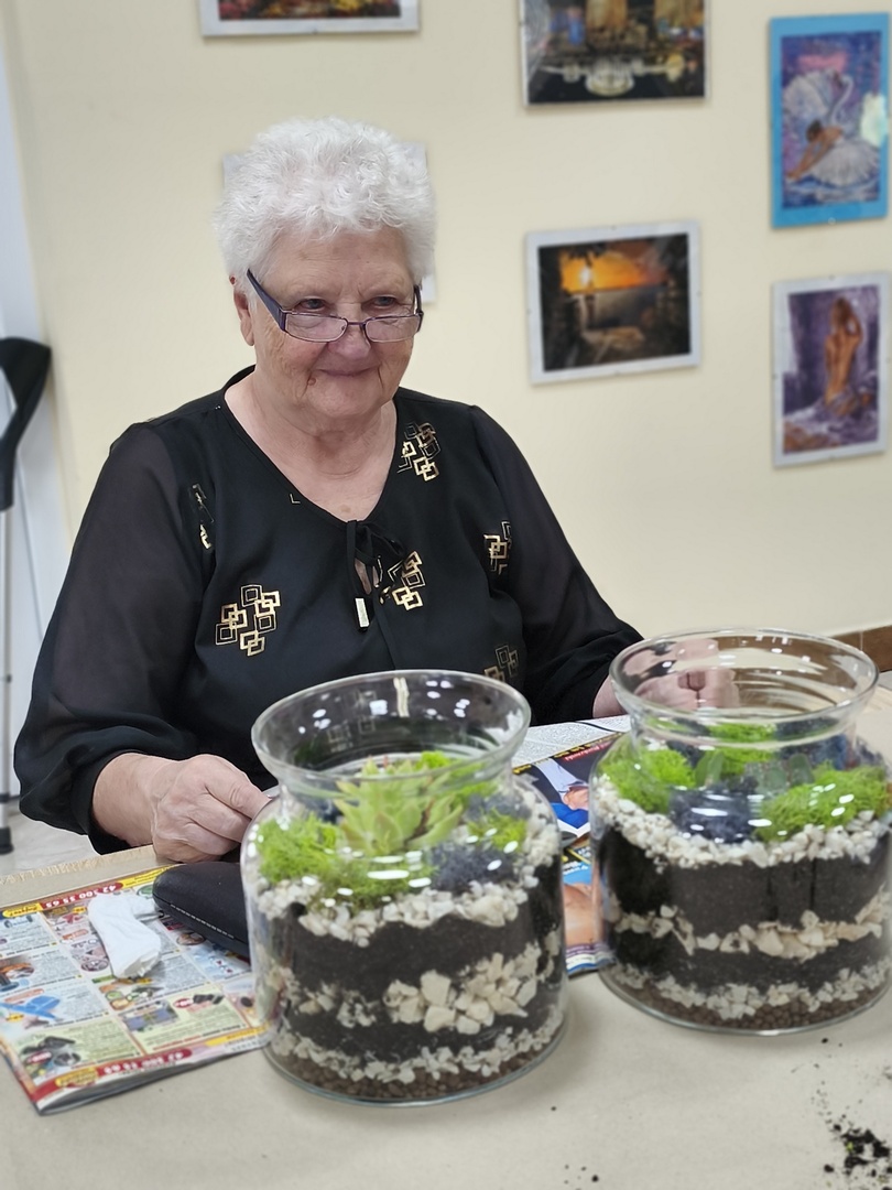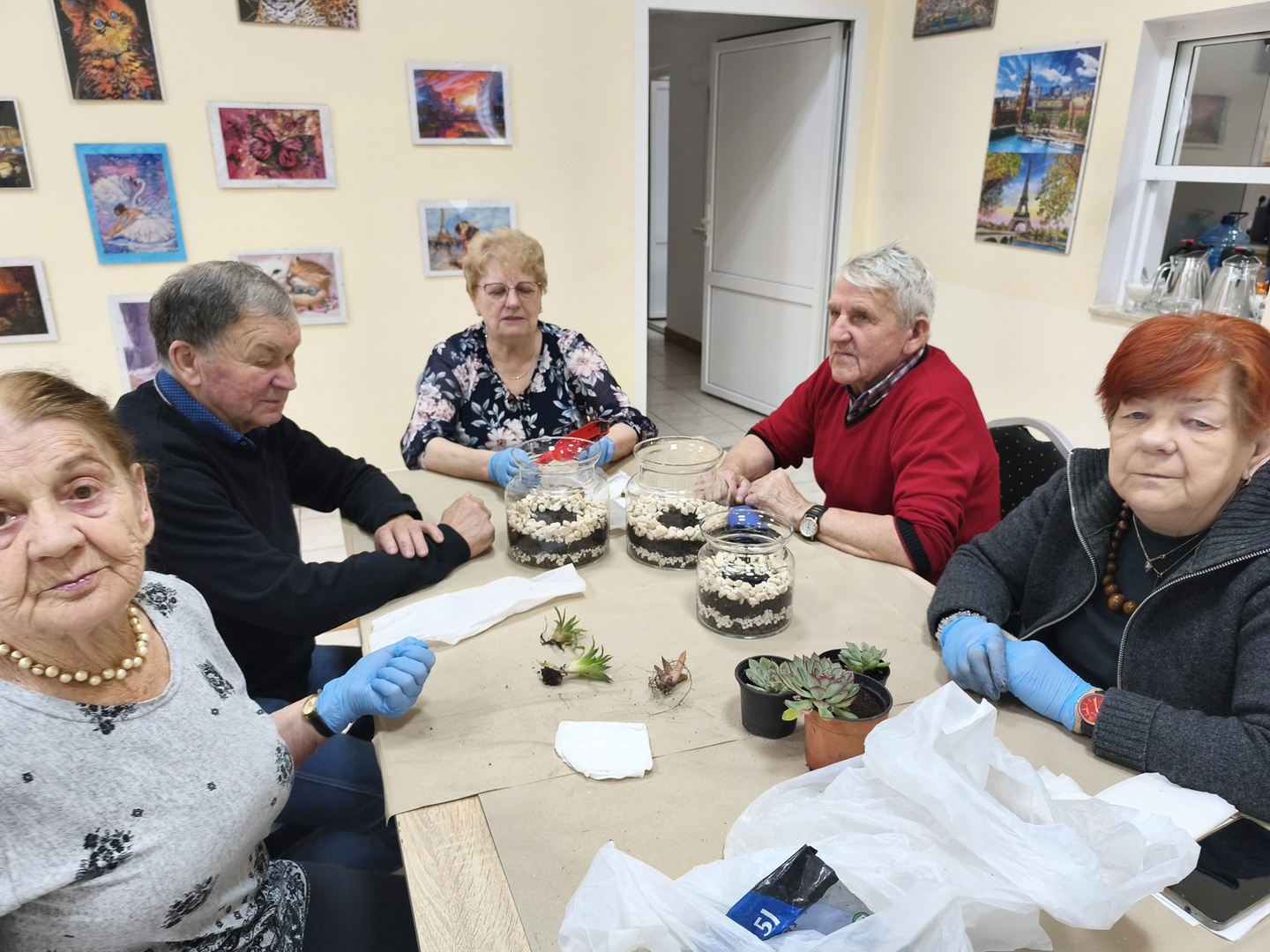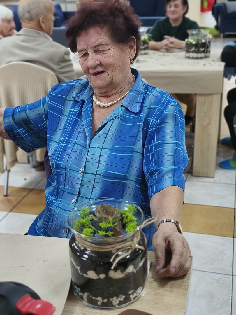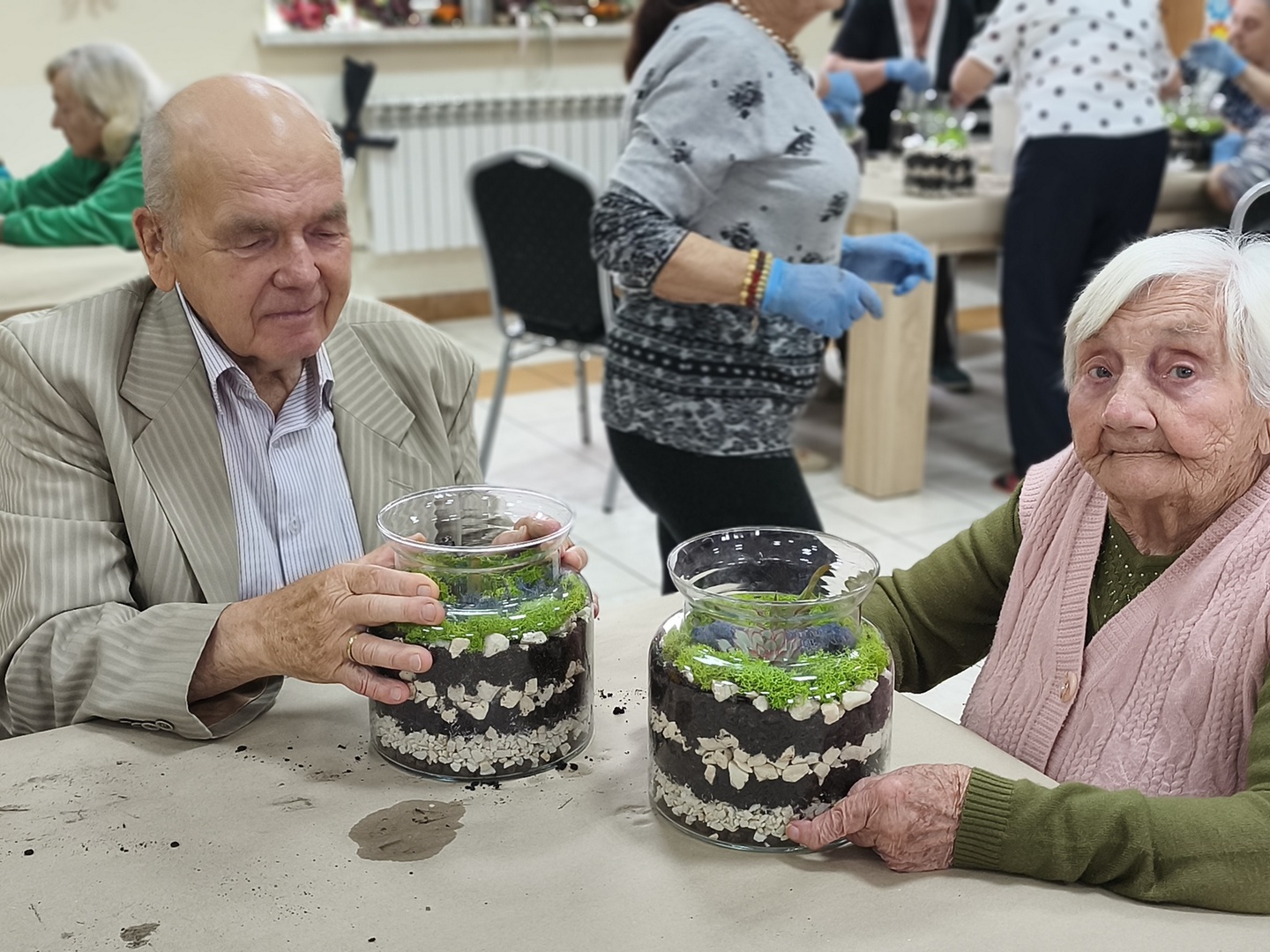 Podczas kolejnych twórczych zajęć z Panią Danusią z Lawendowej Polany przenieśliśmy się w świat natury zamkniętej w szklanym słoiku. Seniorzy z ogromnym zaangażowaniem układali warstwy kamyków i ziemi, a całość dopełniały piękne sukulenty.
