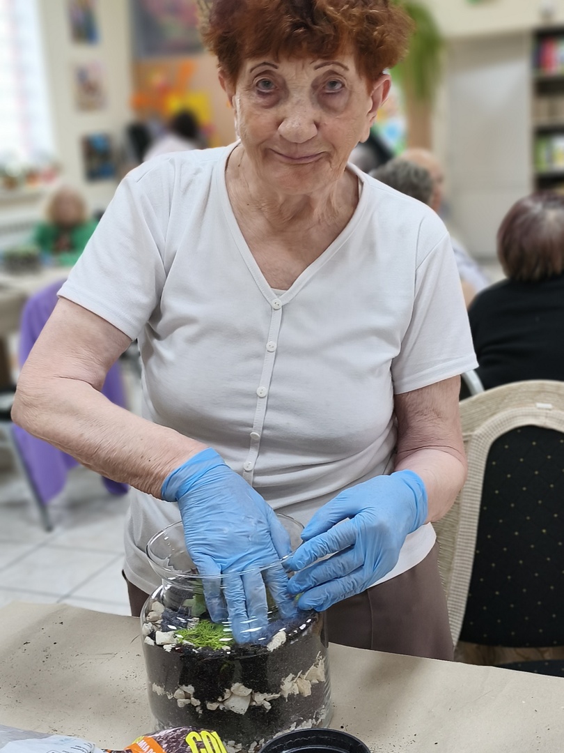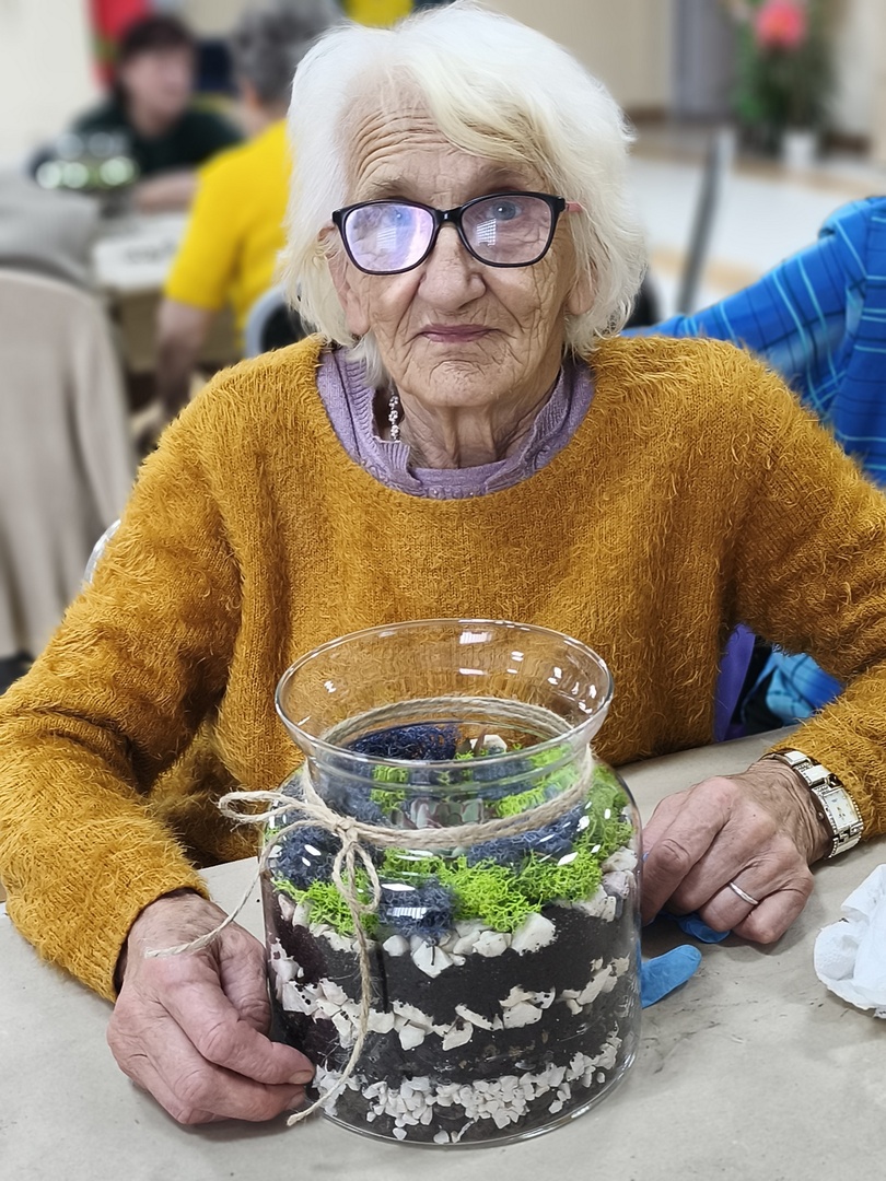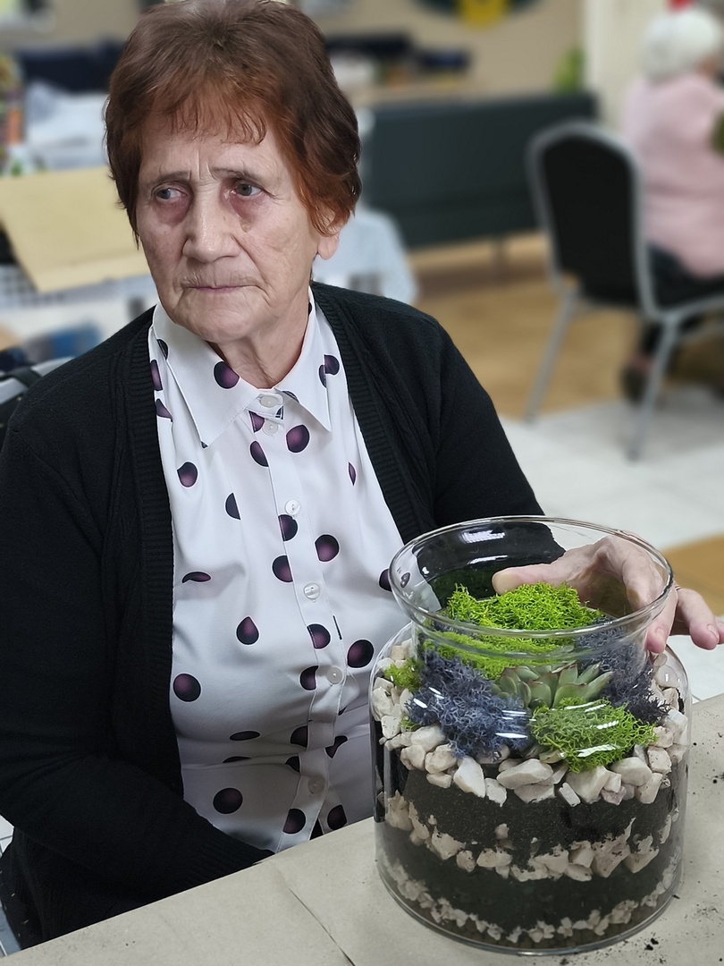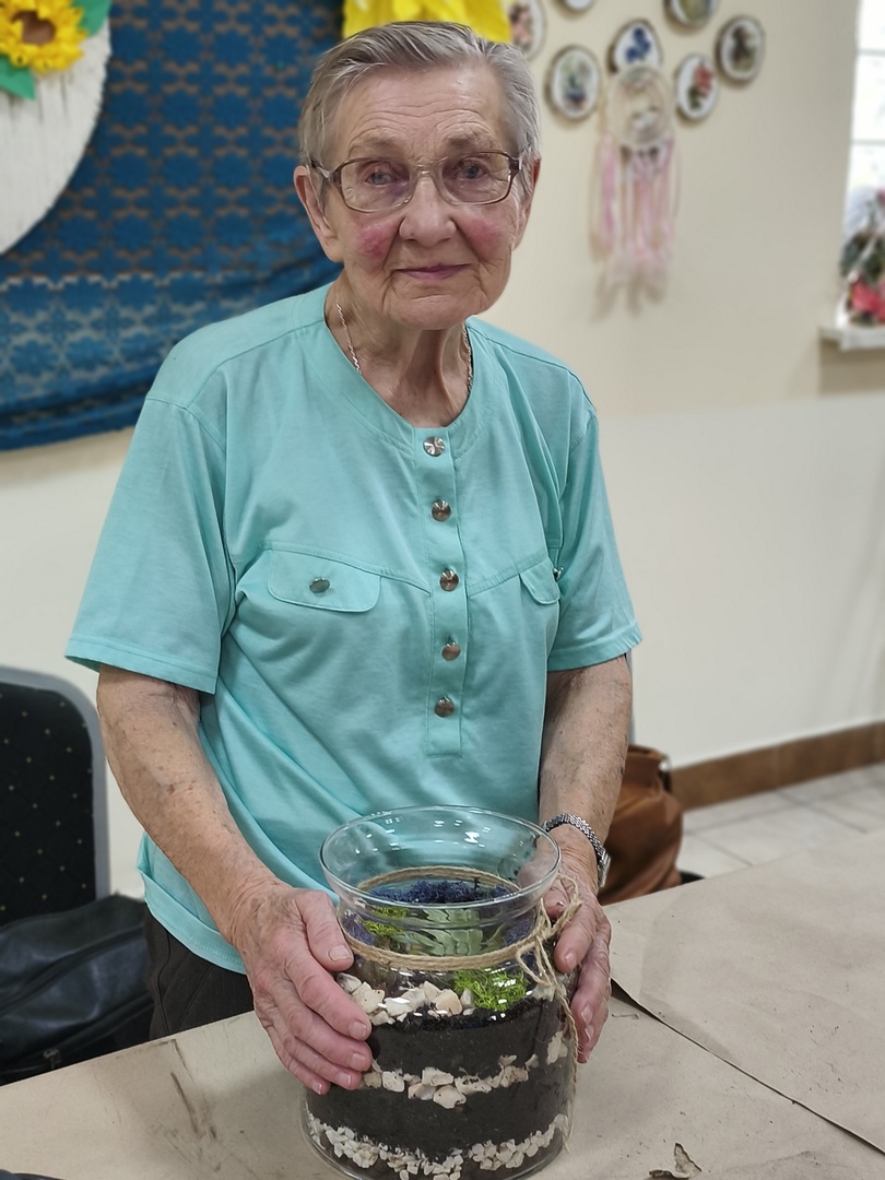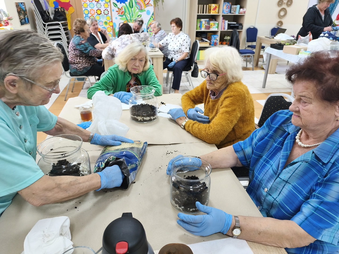 Podczas kolejnych twórczych zajęć z Panią Danusią z Lawendowej Polany przenieśliśmy się w świat natury zamkniętej w szklanym słoiku. Seniorzy z ogromnym zaangażowaniem układali warstwy kamyków i ziemi, a całość dopełniały piękne sukulenty.