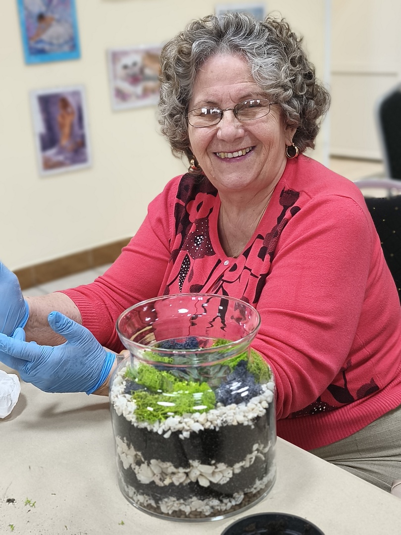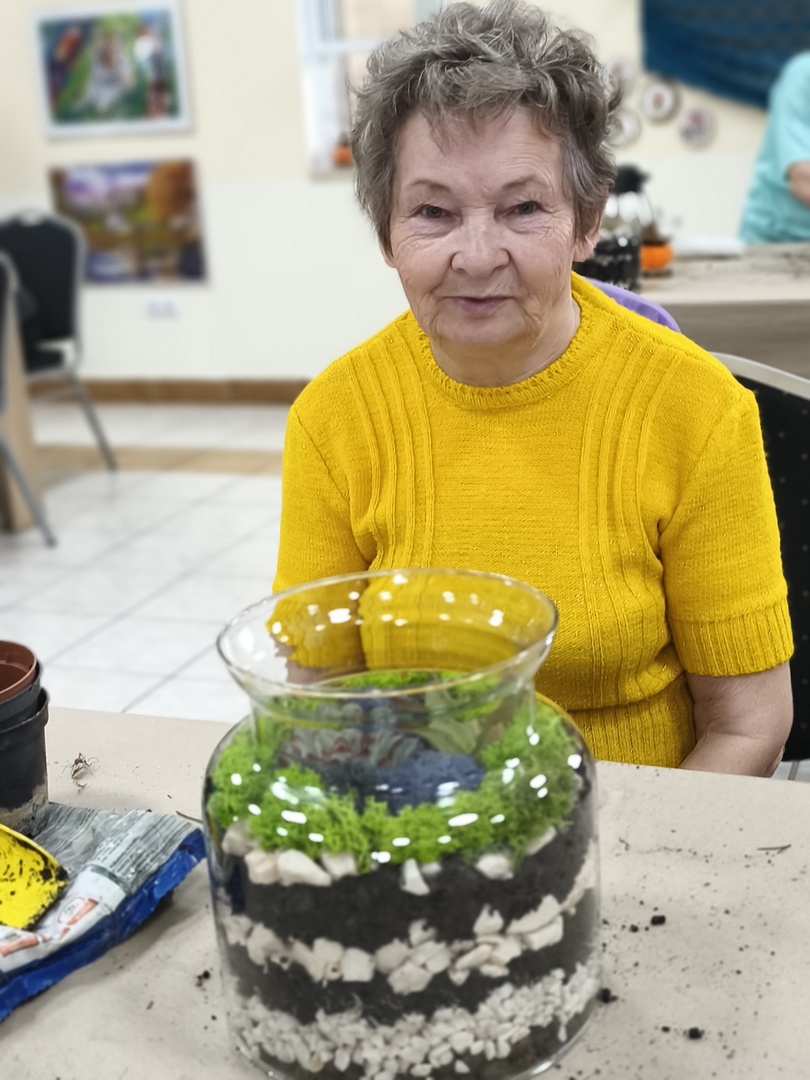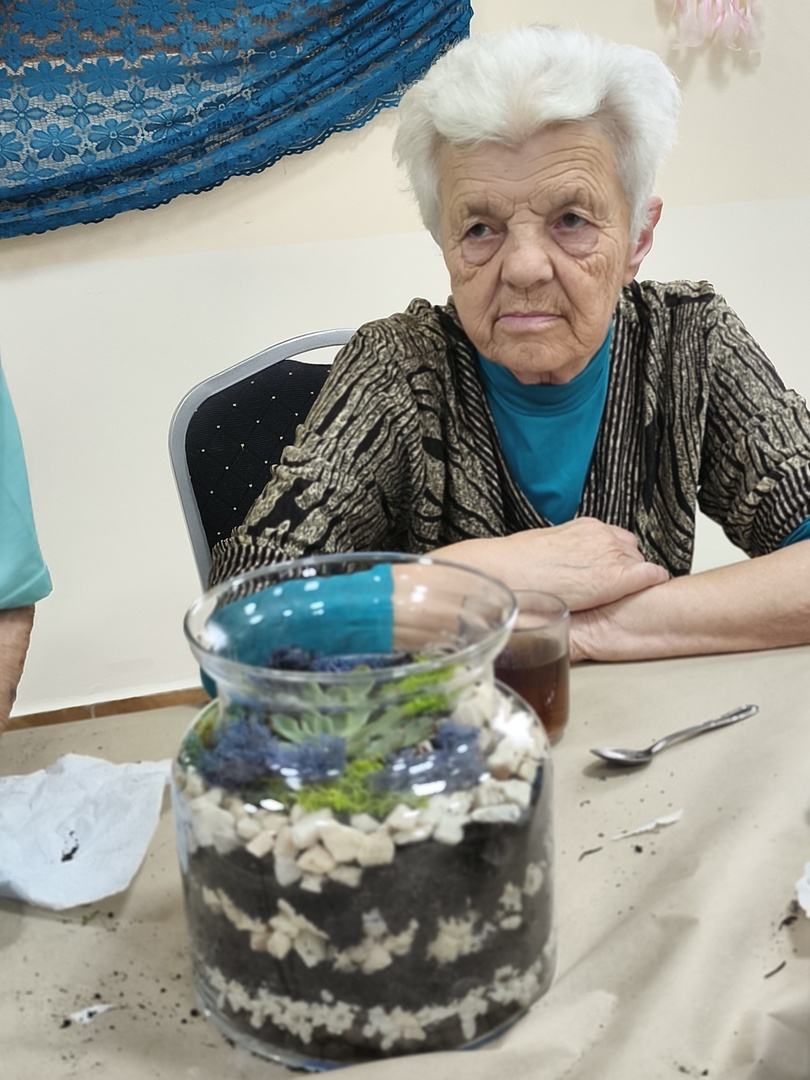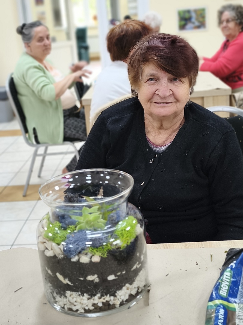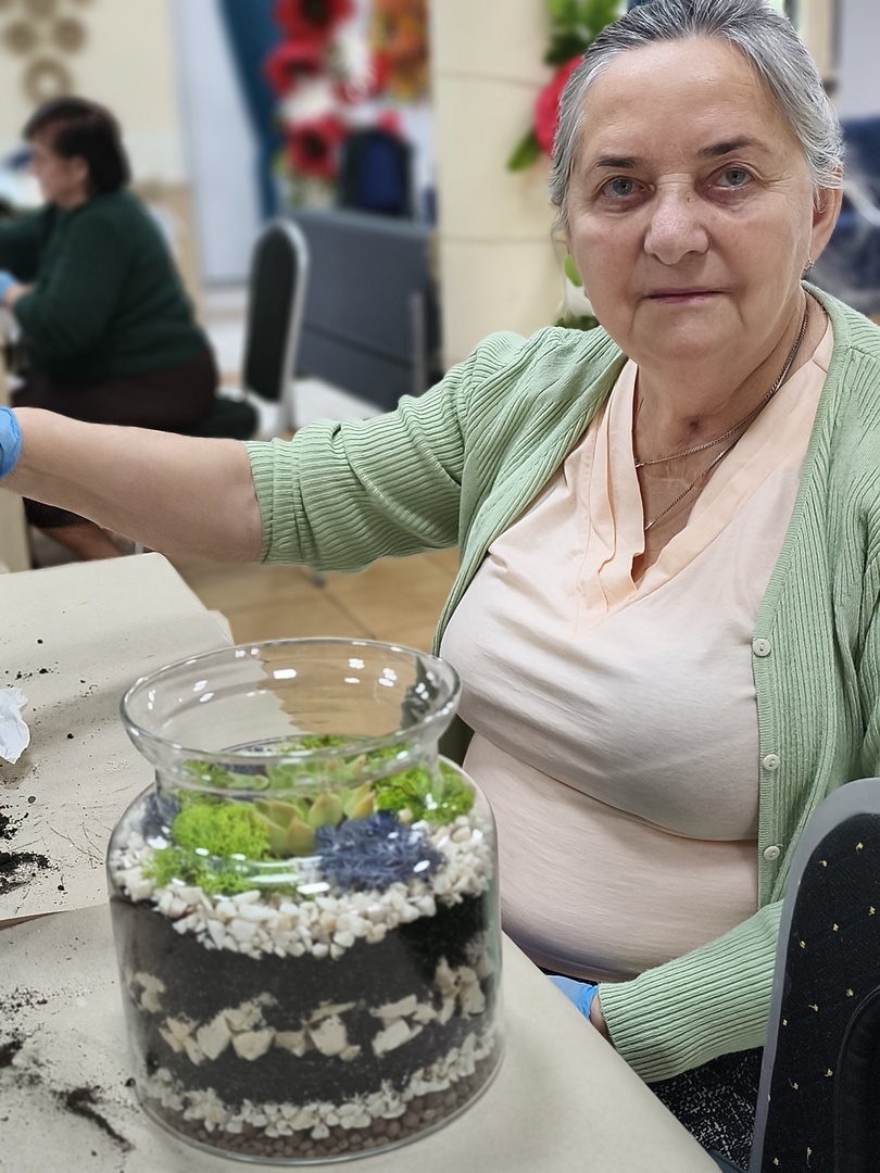 Podczas kolejnych twórczych zajęć z Panią Danusią z Lawendowej Polany przenieśliśmy się w świat natury zamkniętej w szklanym słoiku. Seniorzy z ogromnym zaangażowaniem układali warstwy kamyków i ziemi, a całość dopełniały piękne sukulenty.