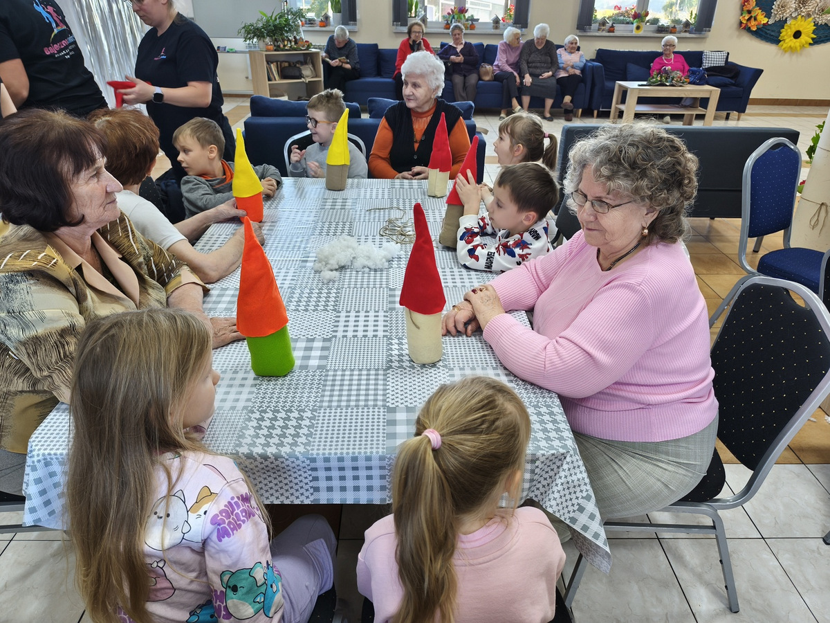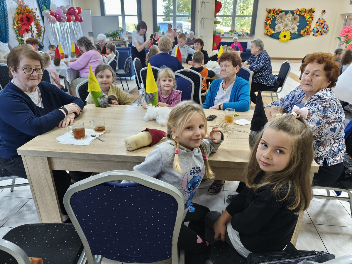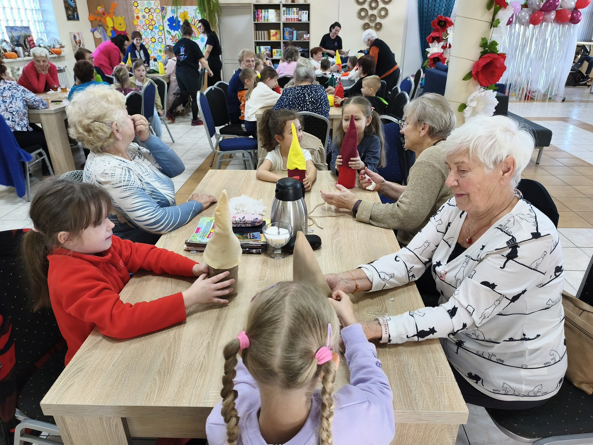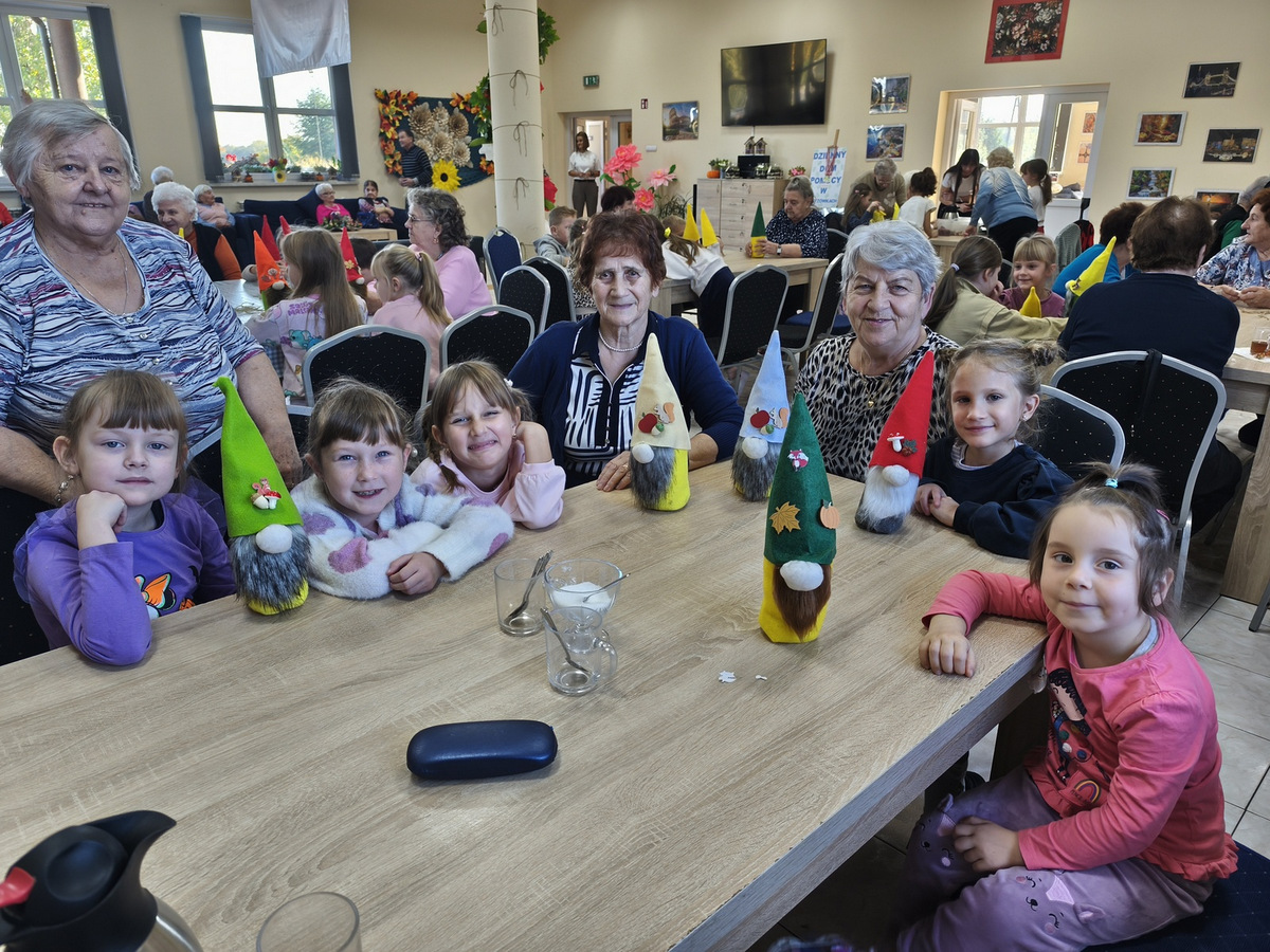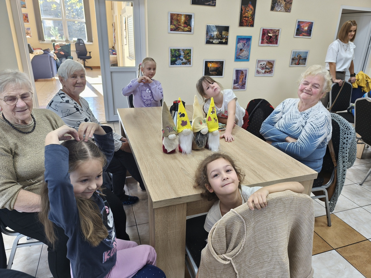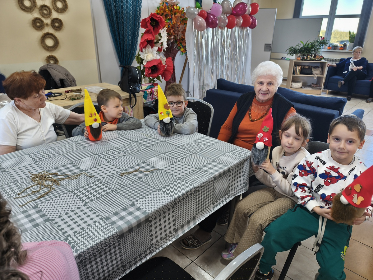 W naszym Dziennym Domu było wyjątkowo gwarno i radośnie! Odwiedziły nas dzieci z zerówki z Zespołu Szkół im. Marii Konopnickiej w Radomicach. Wspólnie z „Bajecznym Światem” uczestnicy tworzyli urocze jesienne skrzaty. Seniorzy z uśmiechem i ciepłem pomagali najmłodszym, a dzieci z wielkim zaangażowaniem przygotowywali swoje małe dzieła. W sali panowała radosna atmosfera, pełna śmiechu, rozmów i serdeczności.