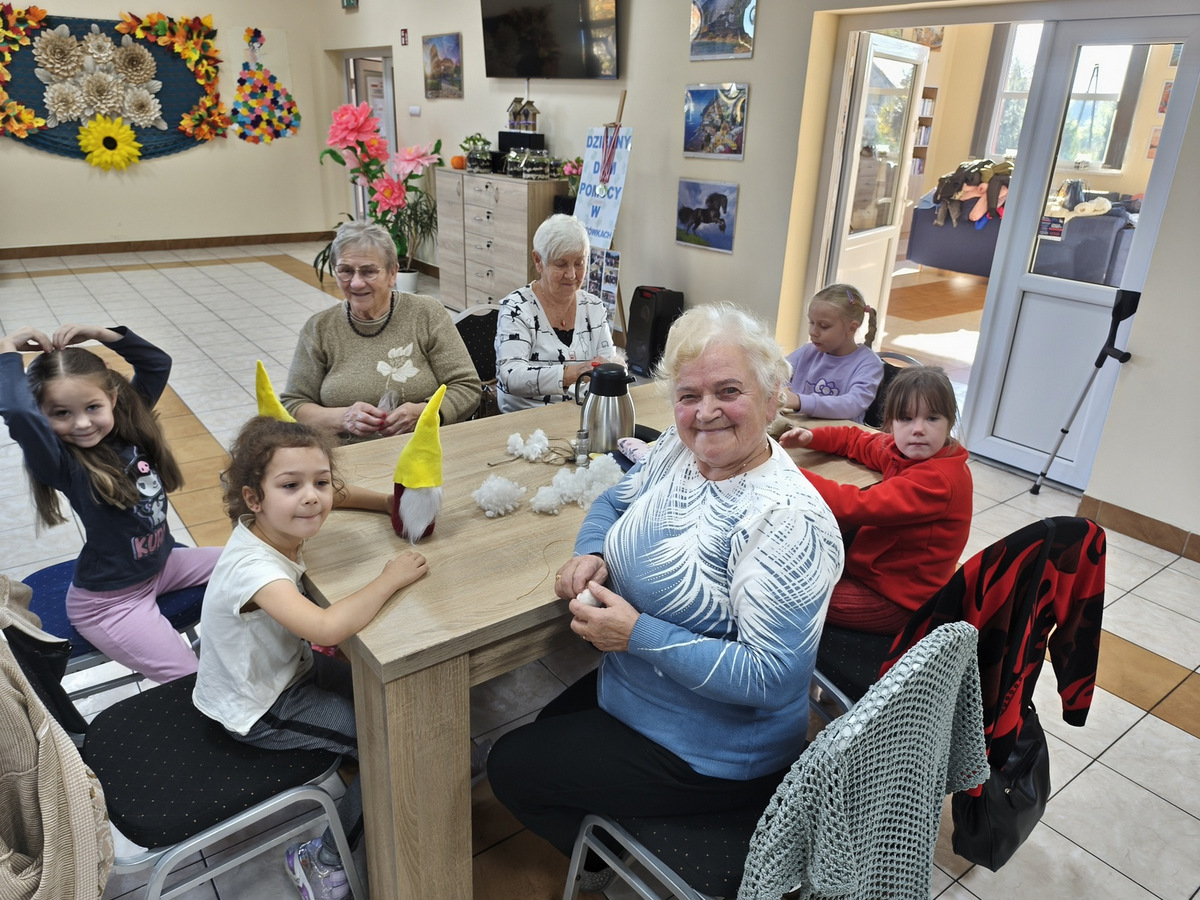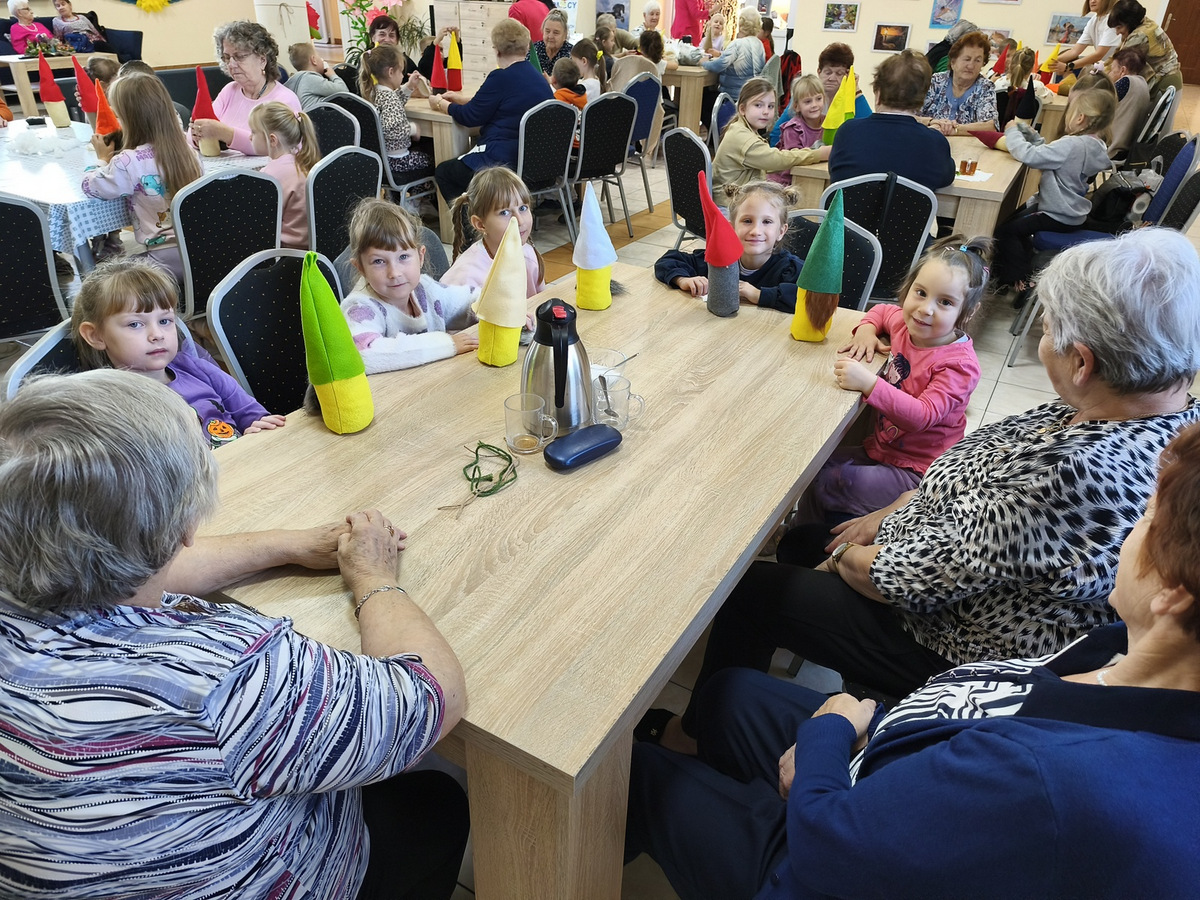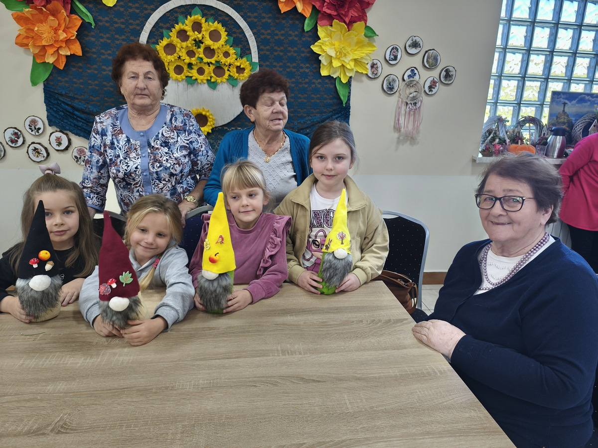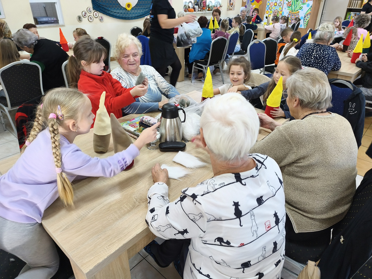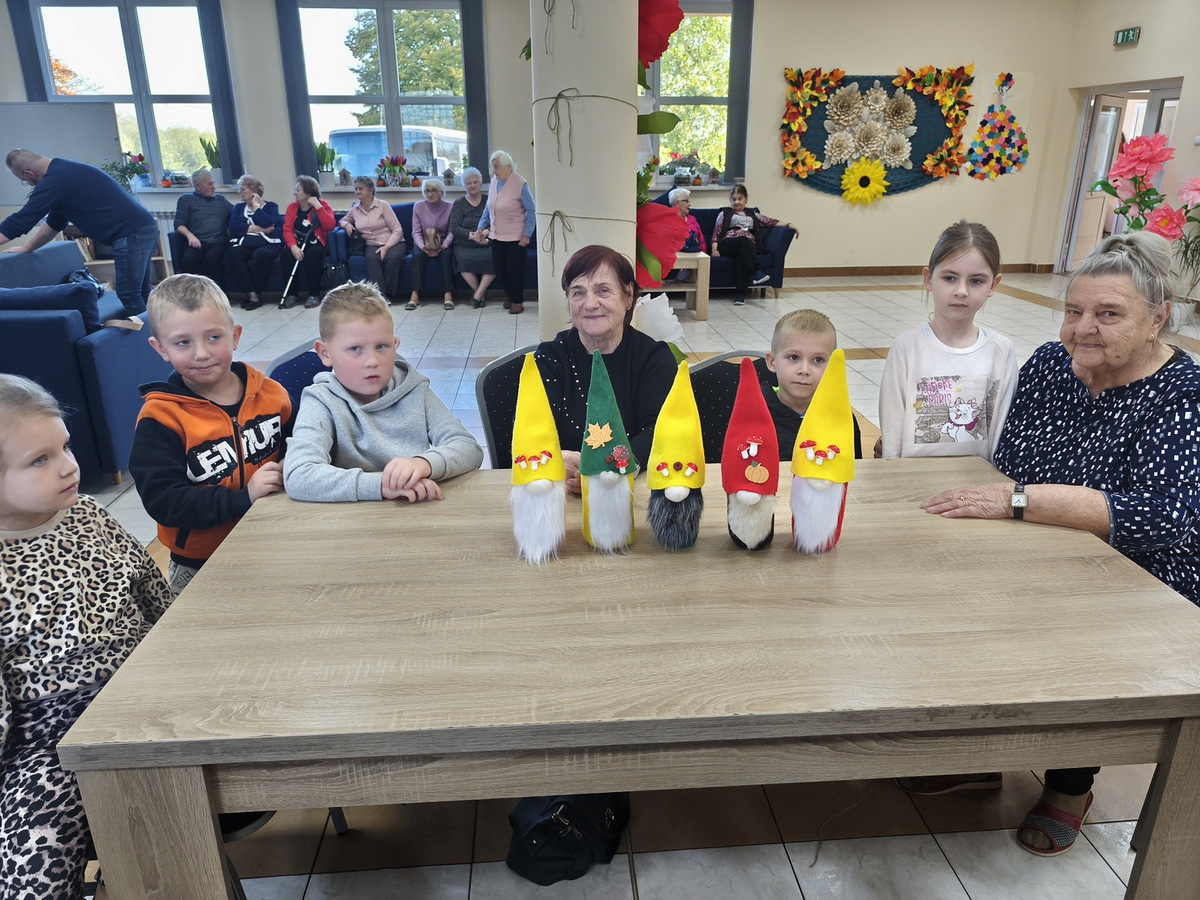 W naszym Dziennym Domu było wyjątkowo gwarno i radośnie! Odwiedziły nas dzieci z zerówki z Zespołu Szkół im. Marii Konopnickiej w Radomicach. Wspólnie z „Bajecznym Światem” uczestnicy tworzyli urocze jesienne skrzaty. Seniorzy z uśmiechem i ciepłem pomagali najmłodszym, a dzieci z wielkim zaangażowaniem przygotowywali swoje małe dzieła. W sali panowała radosna atmosfera, pełna śmiechu, rozmów i serdeczności.