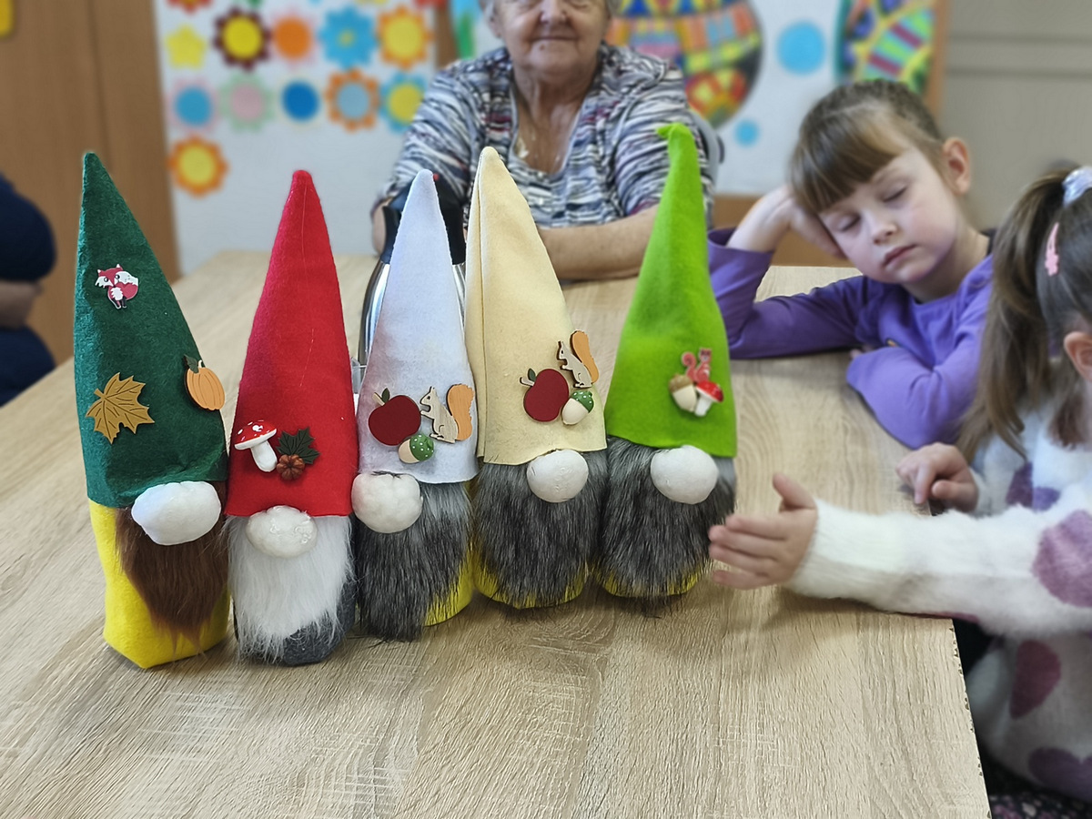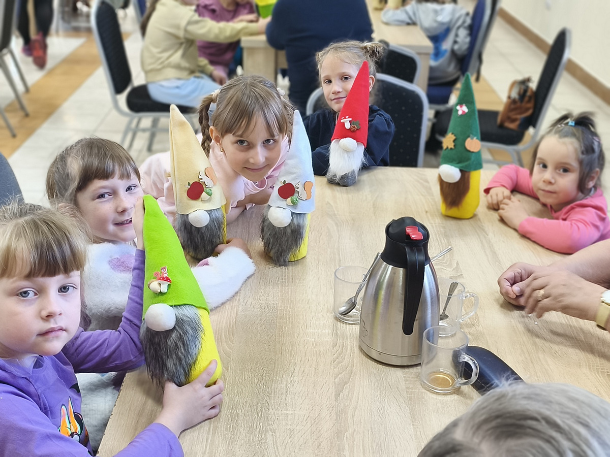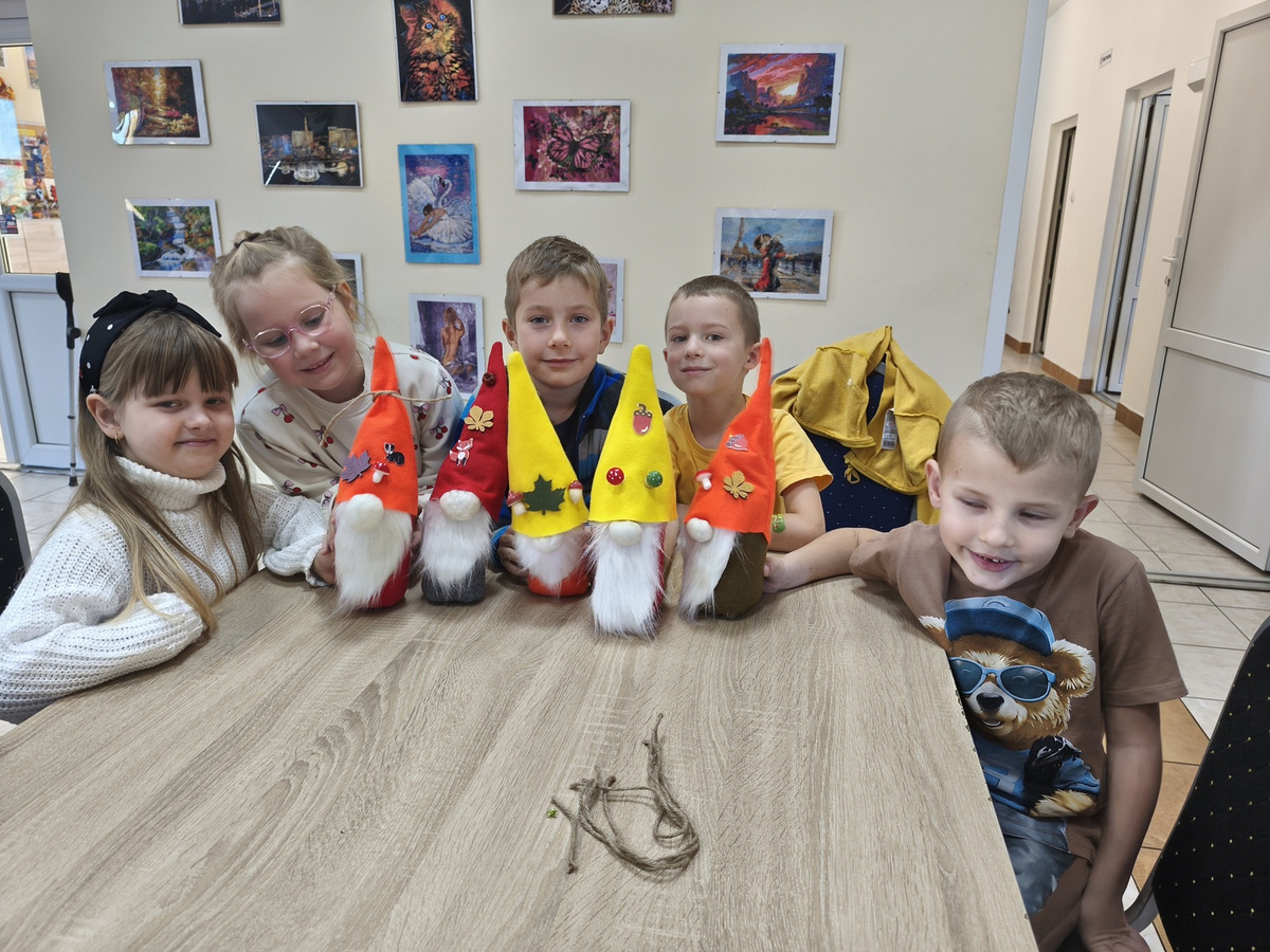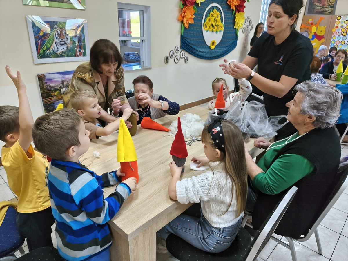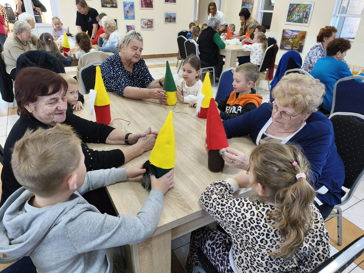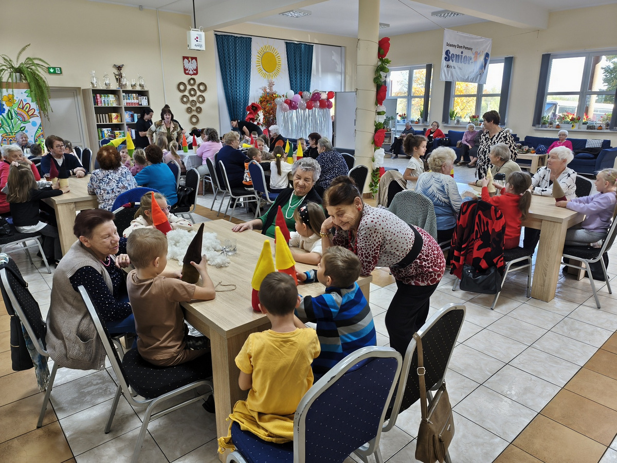 W naszym Dziennym Domu było wyjątkowo gwarno i radośnie! Odwiedziły nas dzieci z zerówki z Zespołu Szkół im. Marii Konopnickiej w Radomicach. Wspólnie z „Bajecznym Światem” uczestnicy tworzyli urocze jesienne skrzaty. Seniorzy z uśmiechem i ciepłem pomagali najmłodszym, a dzieci z wielkim zaangażowaniem przygotowywali swoje małe dzieła. W sali panowała radosna atmosfera, pełna śmiechu, rozmów i serdeczności.