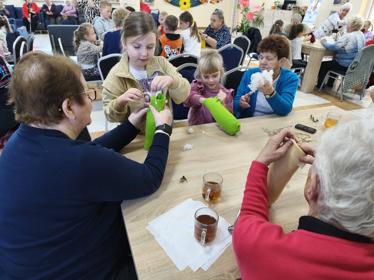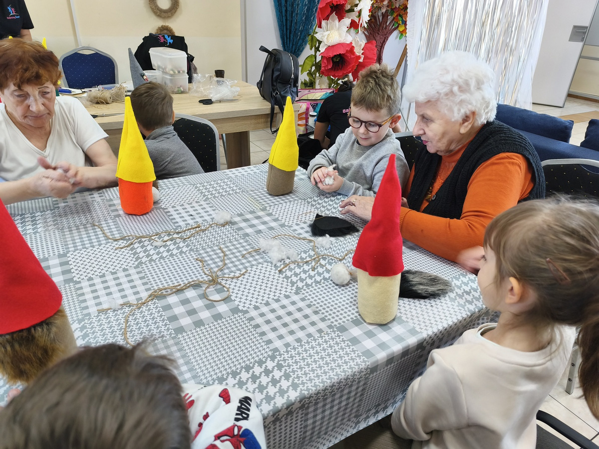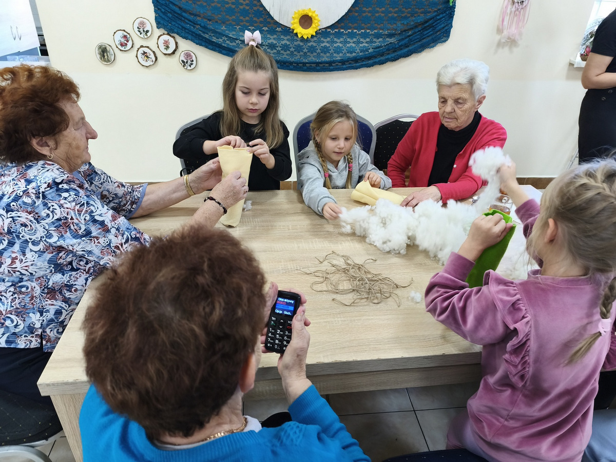 Spotkanie to było pięknym przykładem międzypokoleniowej integracji - dzieci wniosły do naszego Domu energię, spontaniczność i uśmiech. Wspólna praca i zabawa udowodniły, że mimo różnicy wieku łączy nas wiele-radość tworzenia, ciekawość świata i potrzeba bliskości.