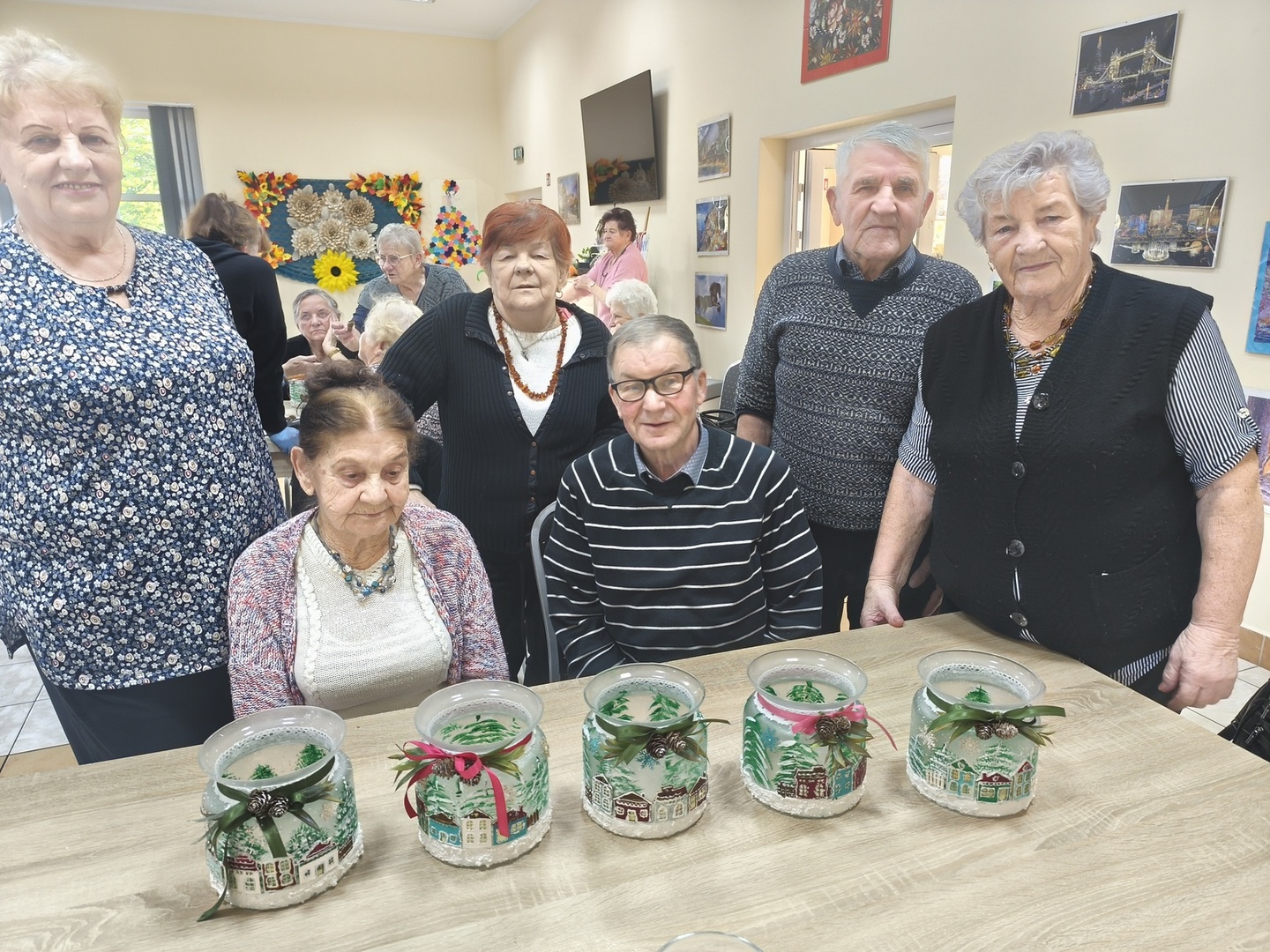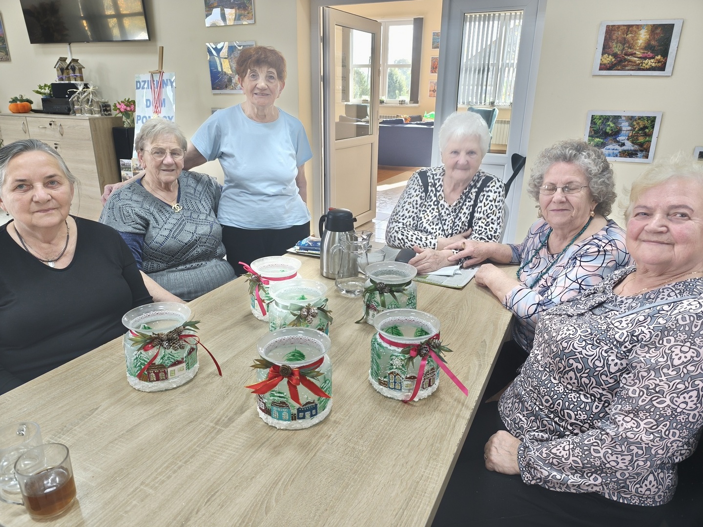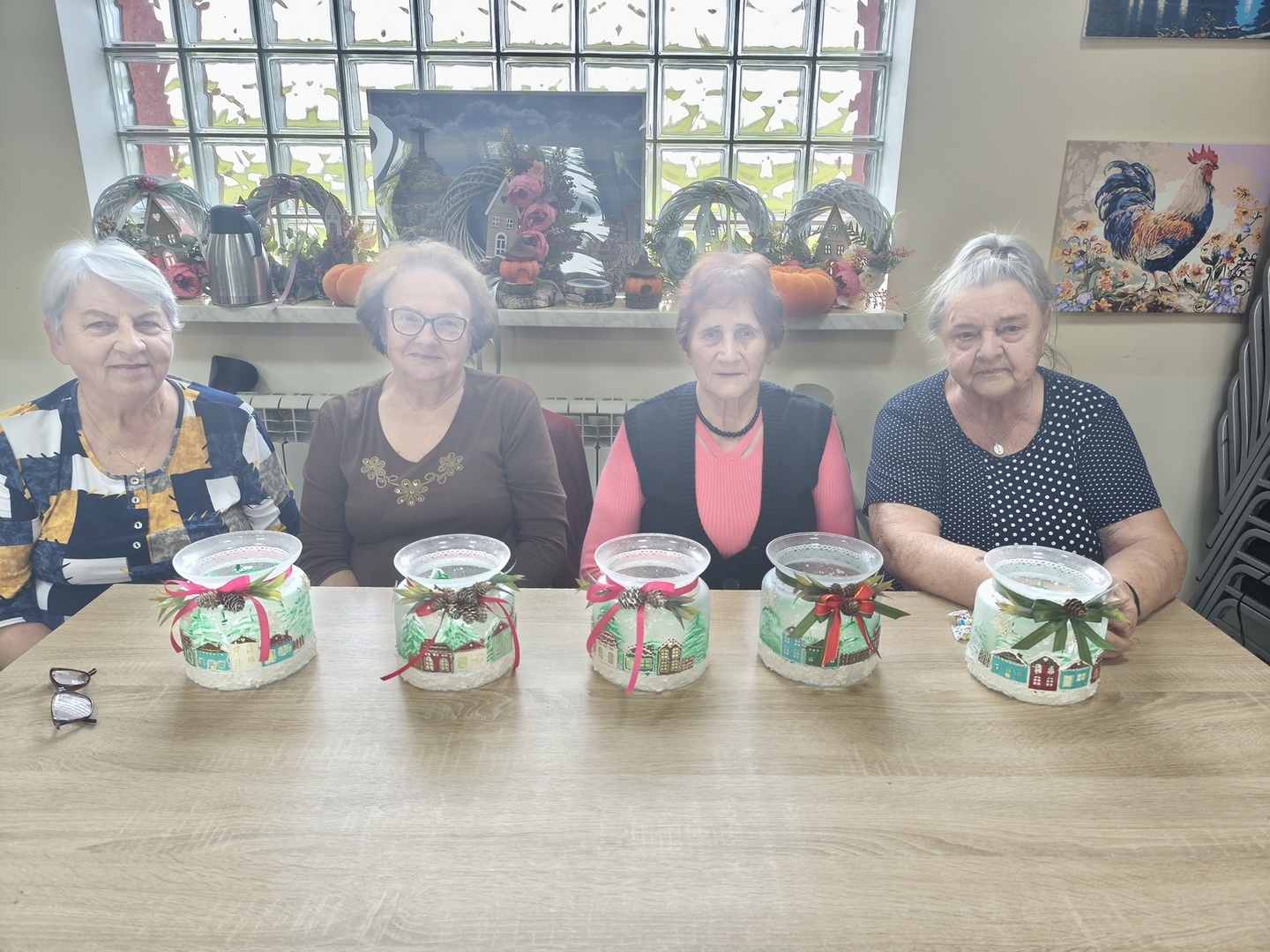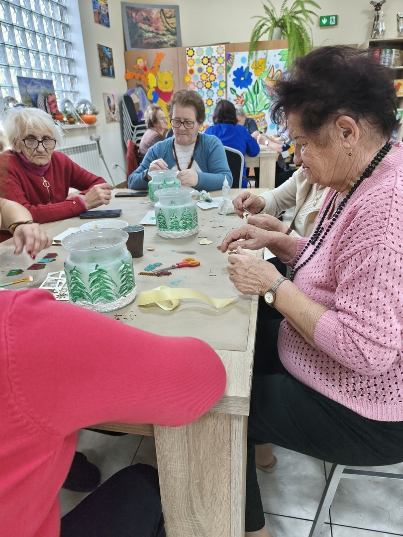 Na kolejnych warsztatach z Panią Danusią z Lawendowej Polany w naszym Domu zapanowała prawdziwie świąteczna atmosfera. Seniorzy tworzyli przepiękne lampiony ze szkła, które rozbłysły zimowym blaskiem. Każdy z uczestników włożył w swoją pracę mnóstwo serca i wyobraźni-na lampionach pojawiły się malownicze, ośnieżone miasteczka, choinki i zimowe pejzaże. Całość dopełniły błyszczące wstążki, gałązki świerku i delikatne szyszki, które sprawiły, że każdy lampion stał się małym dziełem sztuki.