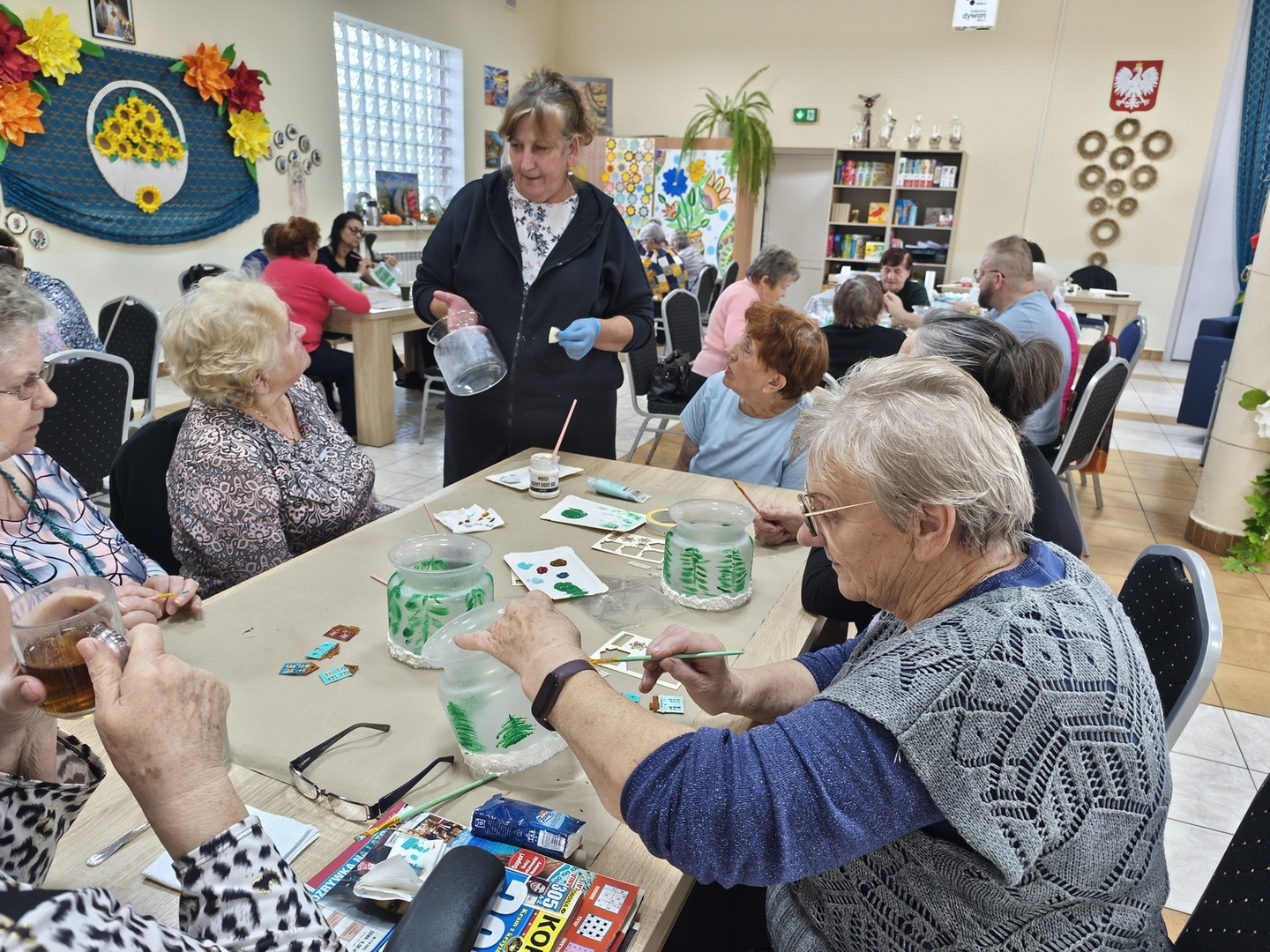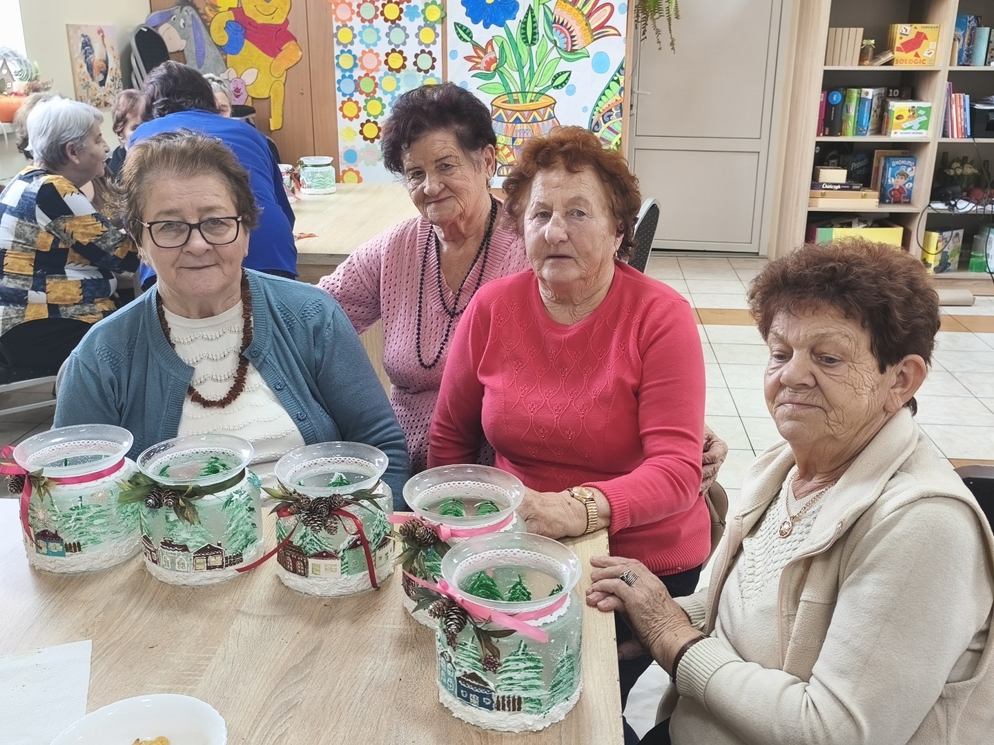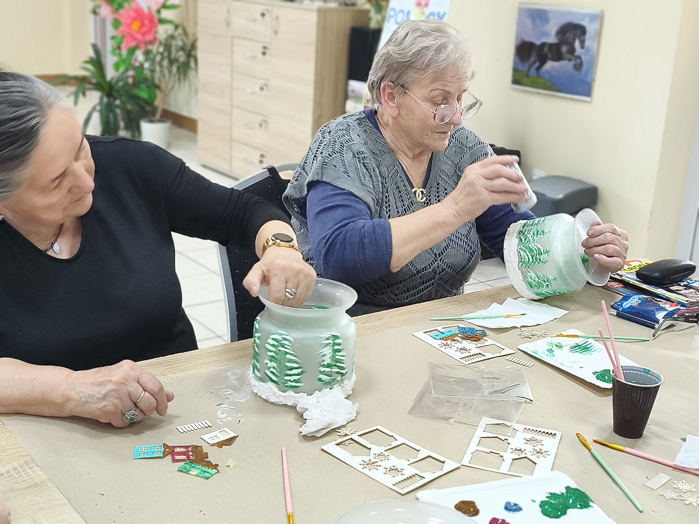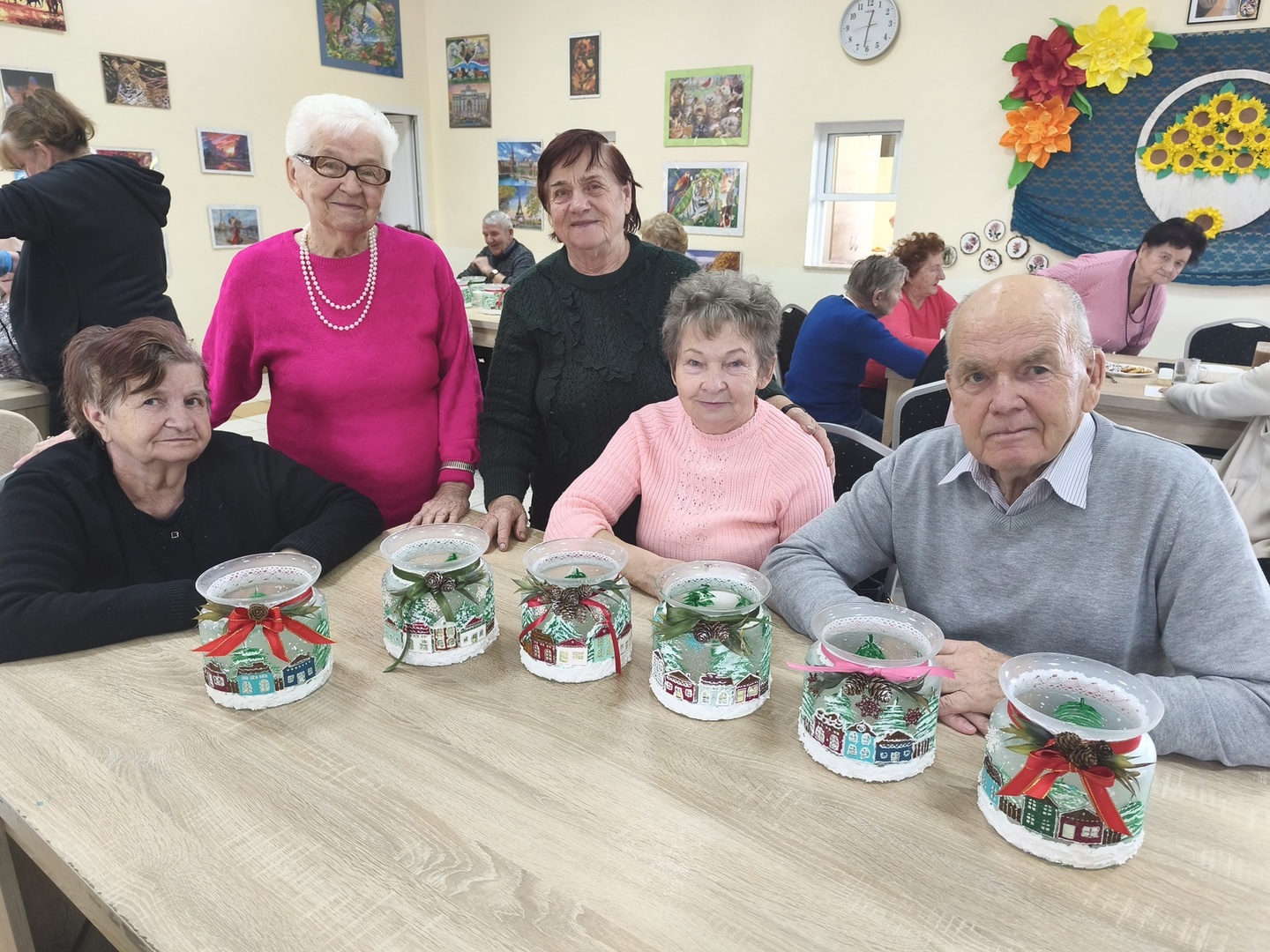 Na kolejnych warsztatach z Panią Danusią z Lawendowej Polany w naszym Domu zapanowała prawdziwie świąteczna atmosfera. Seniorzy tworzyli przepiękne lampiony ze szkła, które rozbłysły zimowym blaskiem. Każdy z uczestników włożył w swoją pracę mnóstwo serca i wyobraźni-na lampionach pojawiły się malownicze, ośnieżone miasteczka, choinki i zimowe pejzaże. Całość dopełniły błyszczące wstążki, gałązki świerku i delikatne szyszki, które sprawiły, że każdy lampion stał się małym dziełem sztuki.