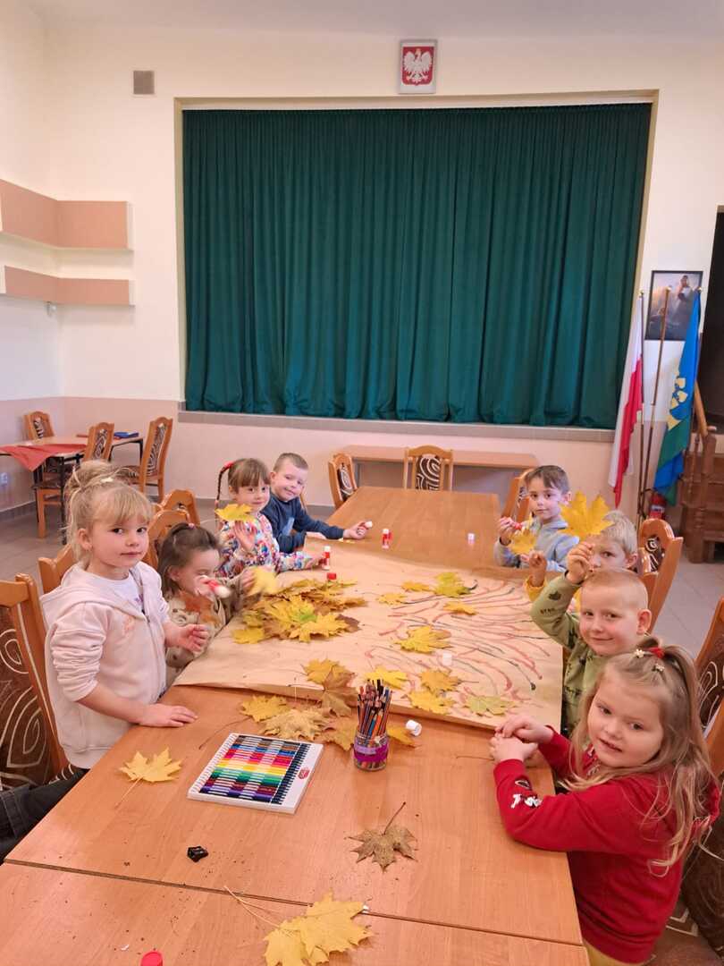 Następnie przedszkolaki wysłuchały bajki o jesiennej przyrodzie, która pomogła im lepiej zrozumieć zmiany zachodzące w naturze. Po wspólnej rozmowie o treści opowiadania dzieci wzięły udział w części plastycznej, podczas której wykonały pracę „Jesienne drzewo” z wykorzystaniem kolorowego papieru i liści.