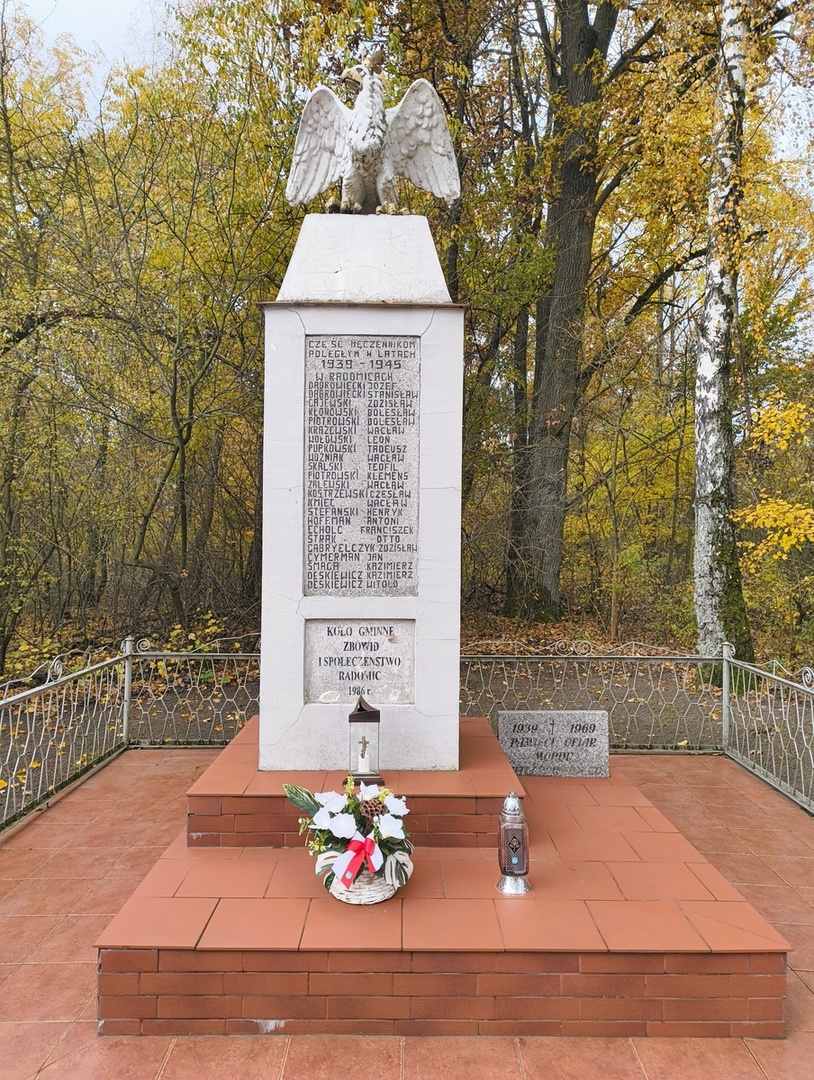 W Radomicach stoi pomnik upamiętniający cywilne ofiary egzekucji dokonanych przez niemiecki Selbstschutz w 1939 roku. Wśród pomordowanych byli głównie miejscowi chłopi i robotnicy, ofiary wojennego terroru. Ich szczątki spoczywają w miejscu, które po wojnie uroczyście oznaczono pomnikiem. W 1986 roku obiekt przeszedł gruntowną renowację i od tego czasu pozostaje pod stałą opieką lokalnej społeczności.