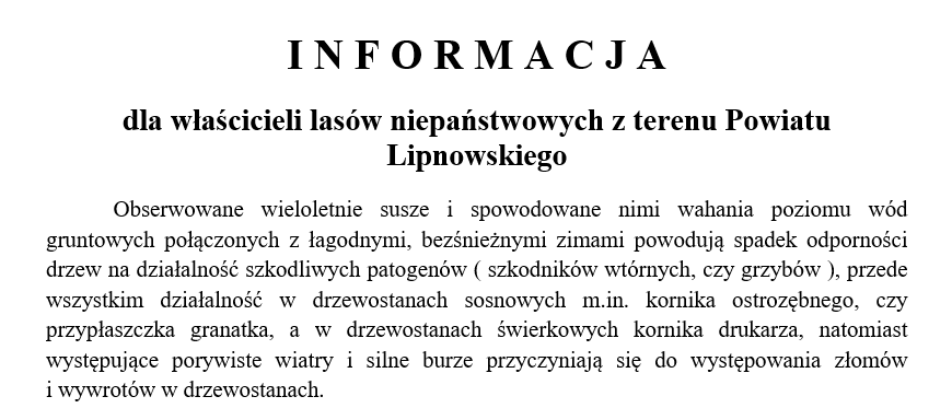 Na podstawie art. 9 ust. 1 ustawy z dnia 28 września 1991 roku o lasach ( t.j. Dz.U. 2025 r., poz. 567 z późń. zm. ) Starosta Lipnowski przypomina, iż w celu zapewnienia powszechnej ochrony lasów właściciele lasów są obowiązani do kształtowania równowagi w ekosystemach leśnych, podnoszenia naturalnej odporności drzewostanów, a w szczególności do :
