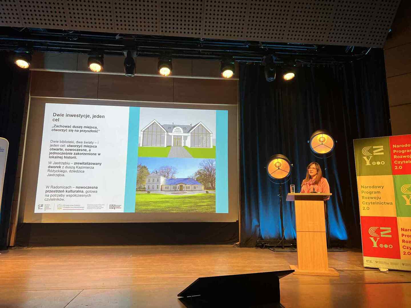 Jednym z kluczowych elementów wystąpienia były projekty infrastrukturalne realizowane w Gminie Lipno. Prelegentka omówiła inwestycję w filię biblioteczną w Jastrzębiu, która dzięki architekturze harmonijnie wpisuje się w krajobraz powiatu lipnowskiego, oraz zaprezentowała koncepcję przyszłego projektu „Przystanek Kultura” w Radomicach – nowoczesnego centrum bibliotecznego, które w przyszłości ma stać się miejscem integracji, edukacji i spotkań dla mieszkańców.