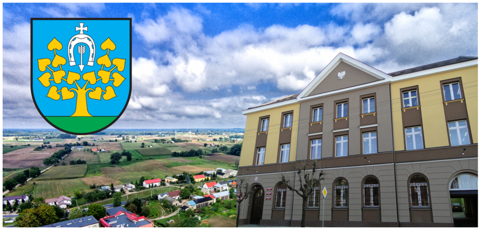 Kwartalnik Gminy Lipno 4/2025 - Budynek urzędu Gminy Lipno wraz z herbem i panoramą jednej ze wsi