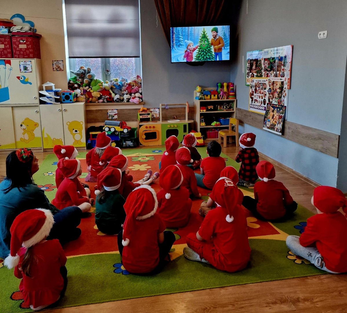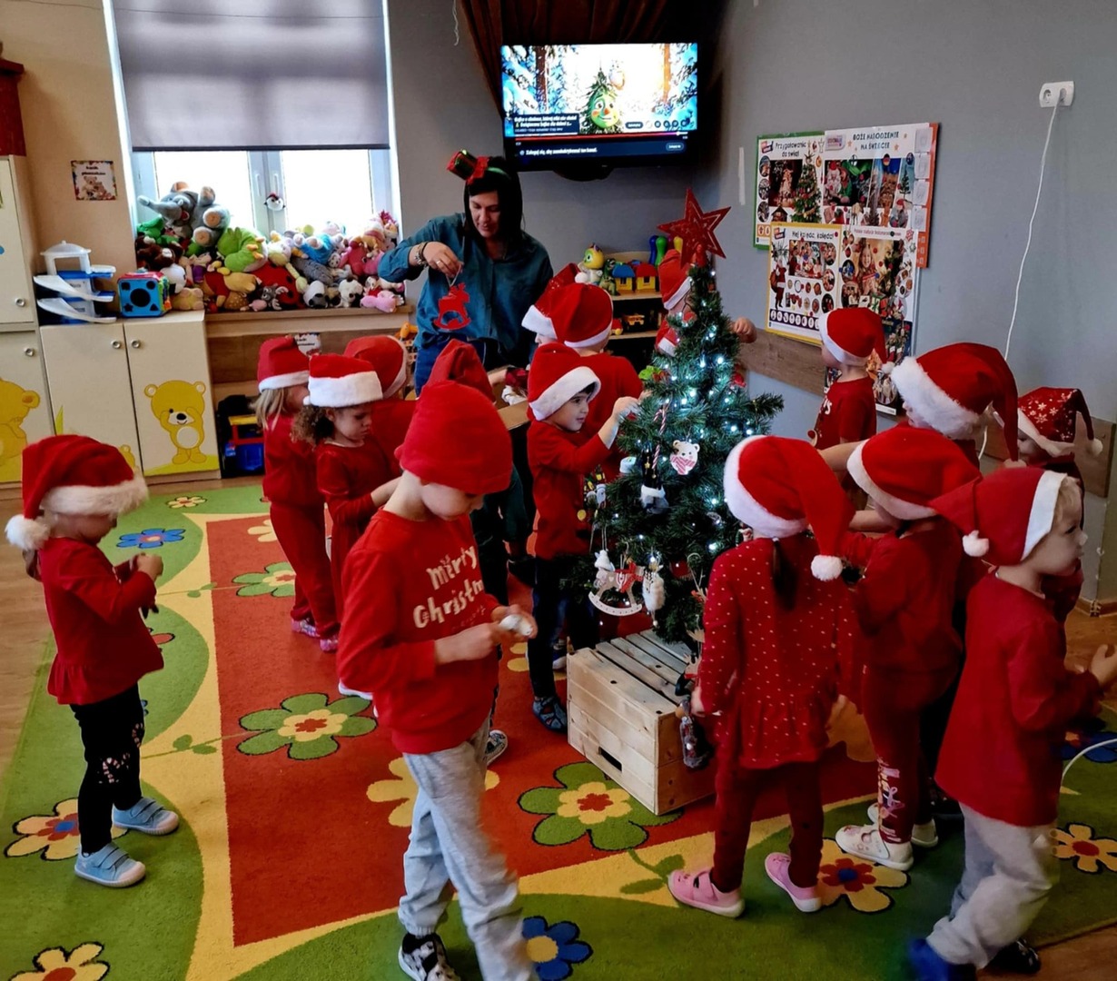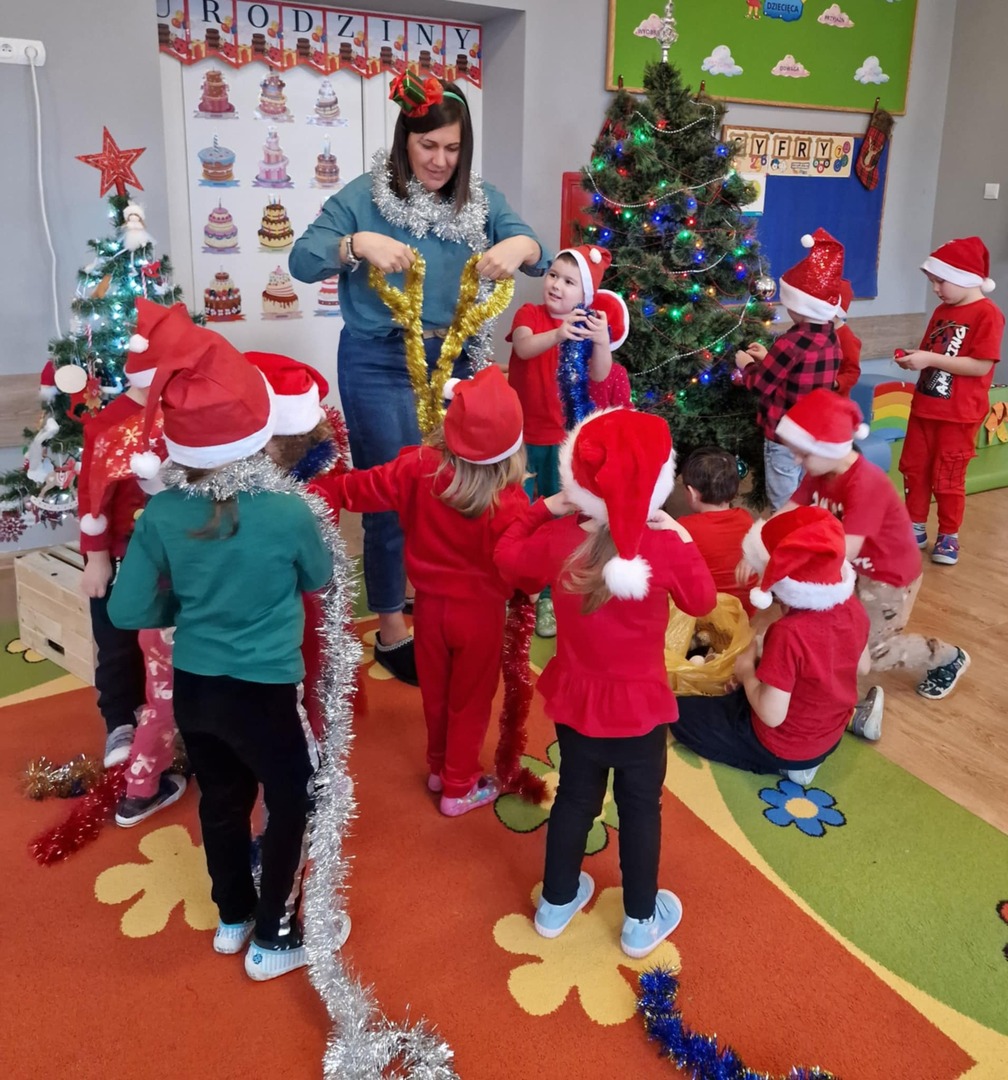 Dzieci obejrzały krótką bajkę „O choince, której nikt nie chciał”. Po projekcji odbyła się rozmowa na temat treści bajki, podczas której przedszkolaki dzieliły się swoimi spostrzeżeniami oraz uczuciami. Następnie przedszkolaki wspólnie z Panią bibliotekarką ubierały choinkę, co sprawiło im wile radości. W trakcie zabawy przedszkolaki zakładały na siebie kolorowe łańcuchy, śmiejąc się i bawiąc w miłej, świątecznej atmosferze.